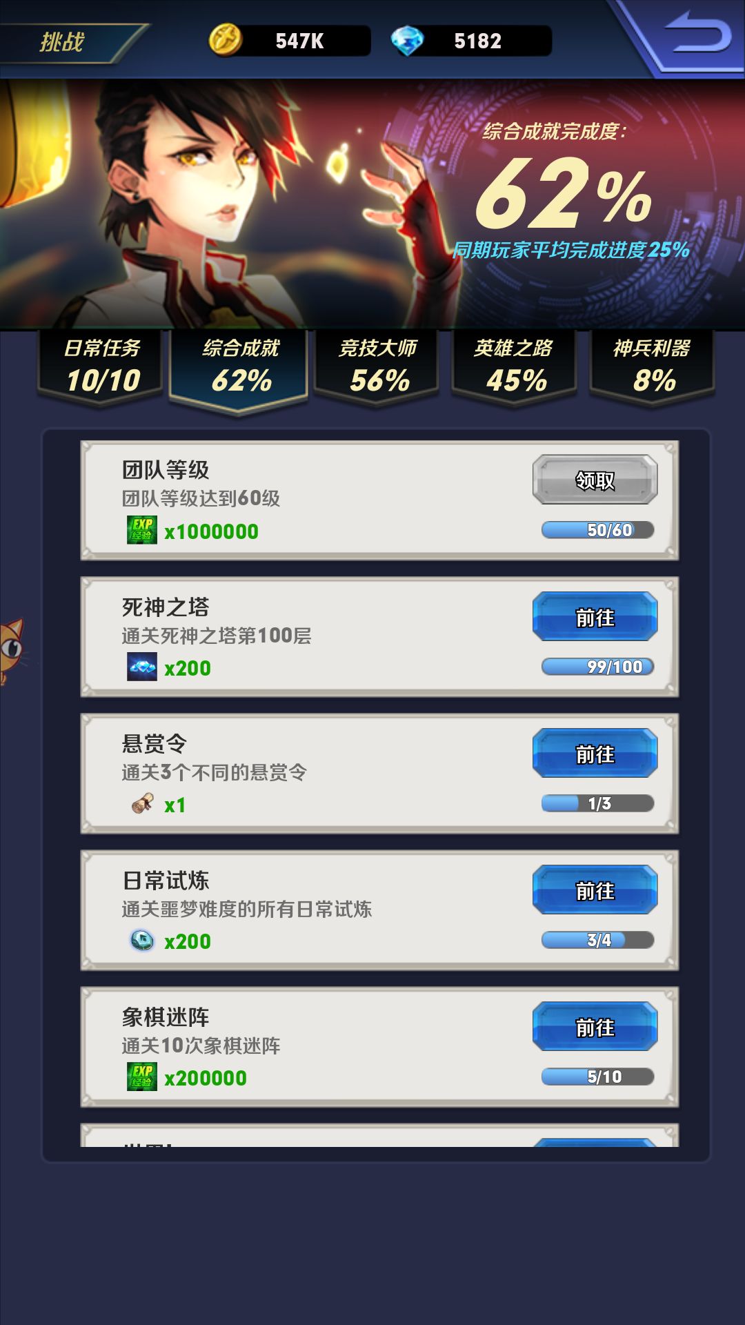 每日挑战界面:这里很多分类的一次性成就奖励和每日成就奖励,达到目标就可以领取了,成就奖励的资源还是很丰富的。