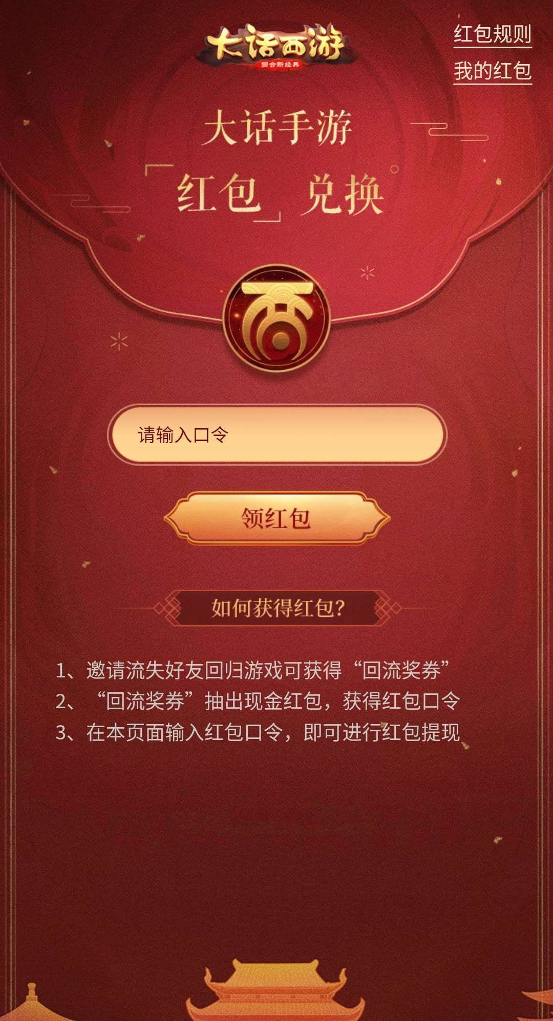 玩家使用“回归奖券”进行抽奖,就有机会获得100、50、20、10元现金红包!抽到红包口令的玩家可以按照游戏内提示进入大话手游红包兑换小程序,在兑换页面输入红包口令就能领取红包并提现!