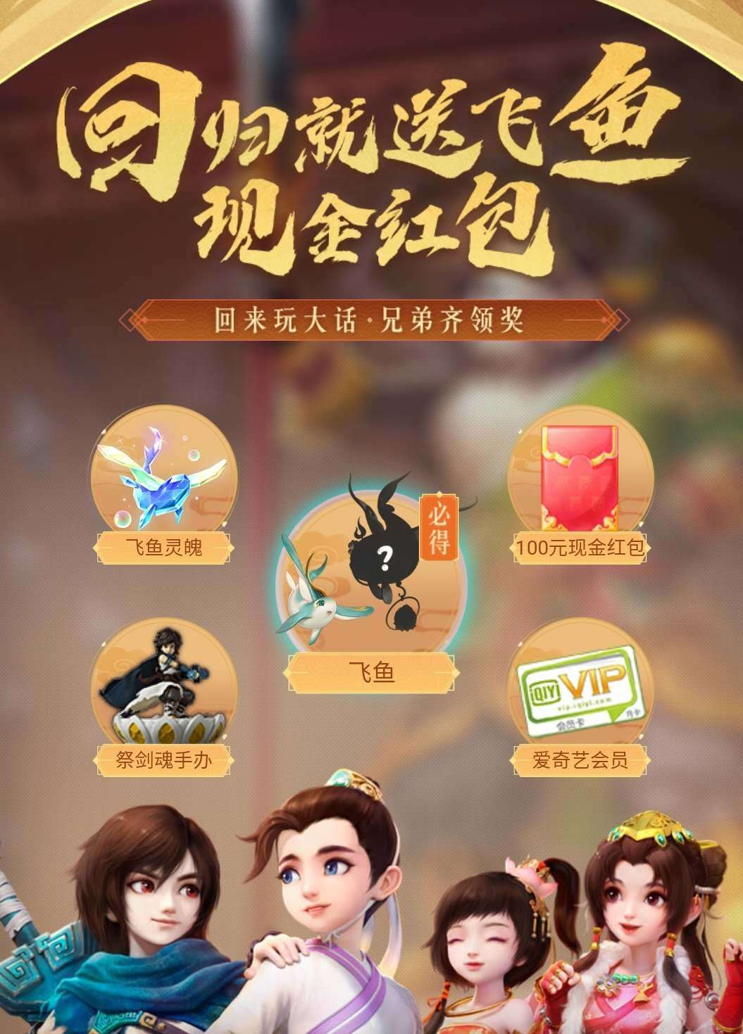 2月27日-3月26日,大话手游2020回归活动正式开启,玩家参与“再聚江湖”活动邀请老友回归,完成活跃度奖励即可抽取“飞鱼灵魄”、祭剑魂手办、100、50、20、10元现金红包,爱奇艺会员卡,游戏道具等丰富好礼!