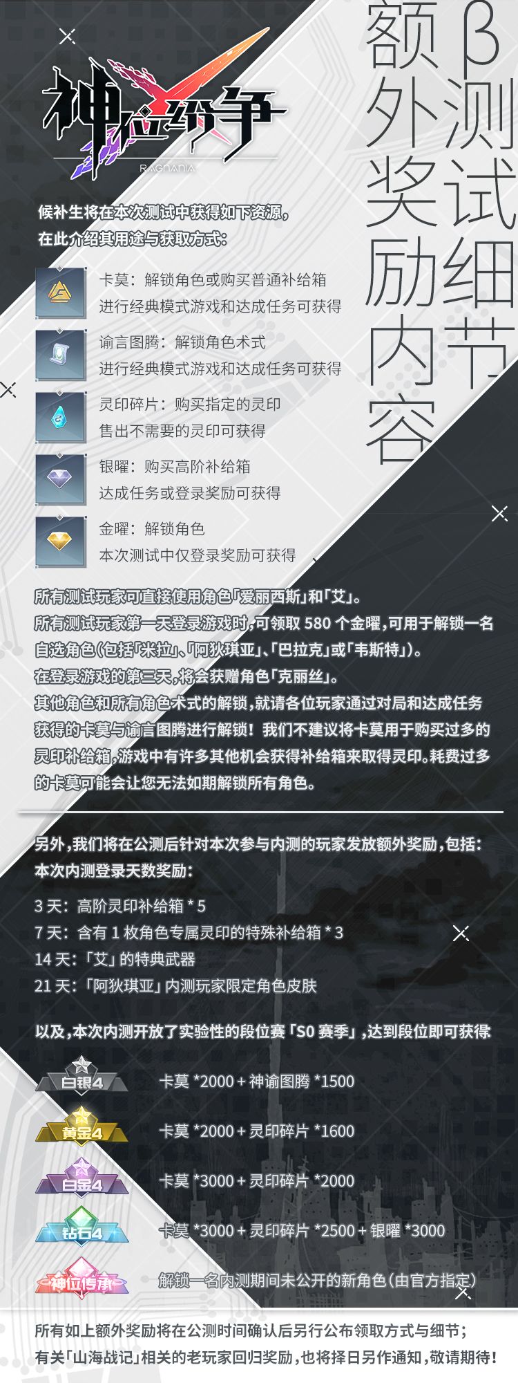 A:本次测试开放了内测期间的排位竞技系统「S-0赛季」,具体奖励如下图奖励细则所示,最终达到更高段位的候补生将获得额外的奖励。所有内测的奖励物品将在公测阶段进行发放,请妥善保管您的相关内测信息。