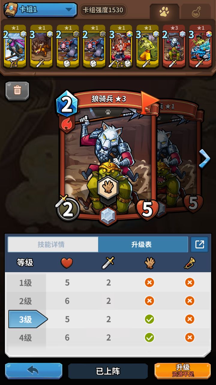 NO.3狼骑兵,为什么推荐升这牌呢,一,他是一个烂大街的牌。二,前期玩家缺少后排输出,所以这个牌3级就有长手技能,还肉只要两个水晶!注意:不过怕蜗牛,章鱼这样的前排,而且后期不介意使用,前期非洲人可以用用!后期有了冲锋技能也是可以用用的!