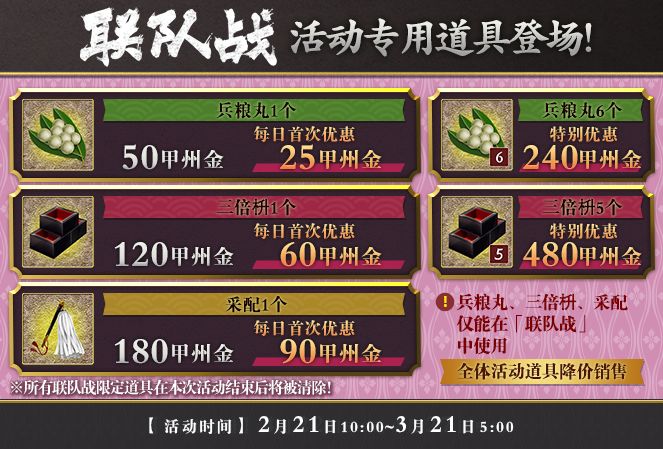 【活动详情】本次万屋将上架所有联队战活动专用道具。在战斗中选择“部队恢复”使用【兵粮丸】,能够补满当前出阵部队中刀剑男士的生存值。在确认出阵前,若审神者选择使用【三倍枡】,则该轮出阵结束后将获得三倍数量的【御岁魂】。使用【采配】则能使已经下场的部队再次出阵。单个道具每日首次购买享有优惠,礼包购买则更有特别优惠。更多道具详情可点击【万屋-特卖】页签查看。
