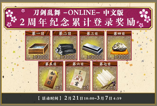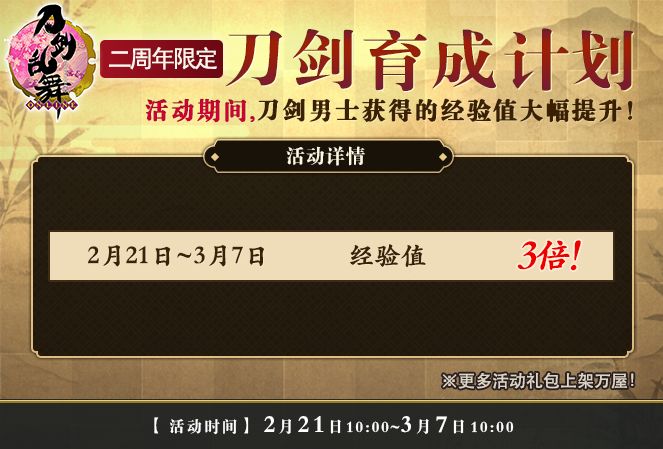 【活动详情】为庆贺中文版上线二周年,特开启超长时间3倍经验应援活动。活动期间,刀剑男士获得的经验值大幅提升至3倍!请审神者不要错过育成刀剑男士的时机。同时,多种经验符活动礼包上架万屋特卖,搭配使用能够助力刀剑男士更快成长!