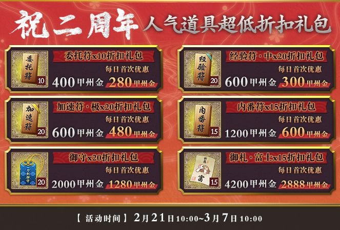 【活动详情】为庆贺中文版上线二周年,万屋将特别上架6款人气道具折扣礼包。低价史无前例,请各位审神者不要错过!委托符折扣礼包内含委托符*10,原价400甲州金,每日首次购买折扣价280甲州金。经验符·中折扣礼包内含经验符·中*20,原价600甲州金,每日首次购买折扣价300甲州金。加速符·极折扣礼包内含加速符·极*20,原价600甲州金,每日首次购买折扣价480甲州金。内番符折扣礼包内含内番符*15,原价1200甲州金,每日首次购买折扣价600甲州金。御守折扣礼包内含委托符*20,原价2000甲州金,每日首次购买折扣价1280甲州金。御札·富士符折扣礼包内含御札·富士*15,原价4200甲州金,每日首次购买折扣价2888甲州金。