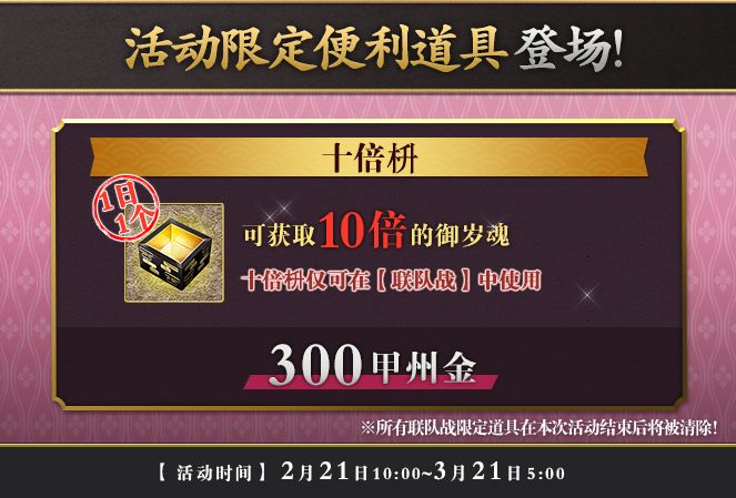 【活动详情】活动期间内,万屋将上架联队战全新活动便利道具【十倍枡】。在确认出阵前,若审神者选择使用本次联队战新增便利道具【十倍枡】,则本轮出阵结束后将获得十倍数量的【御岁魂】。该道具只能在联队战活动中使用。每个【十倍枡】售价300甲州金,每日限量购买1个,请不要错过机会!