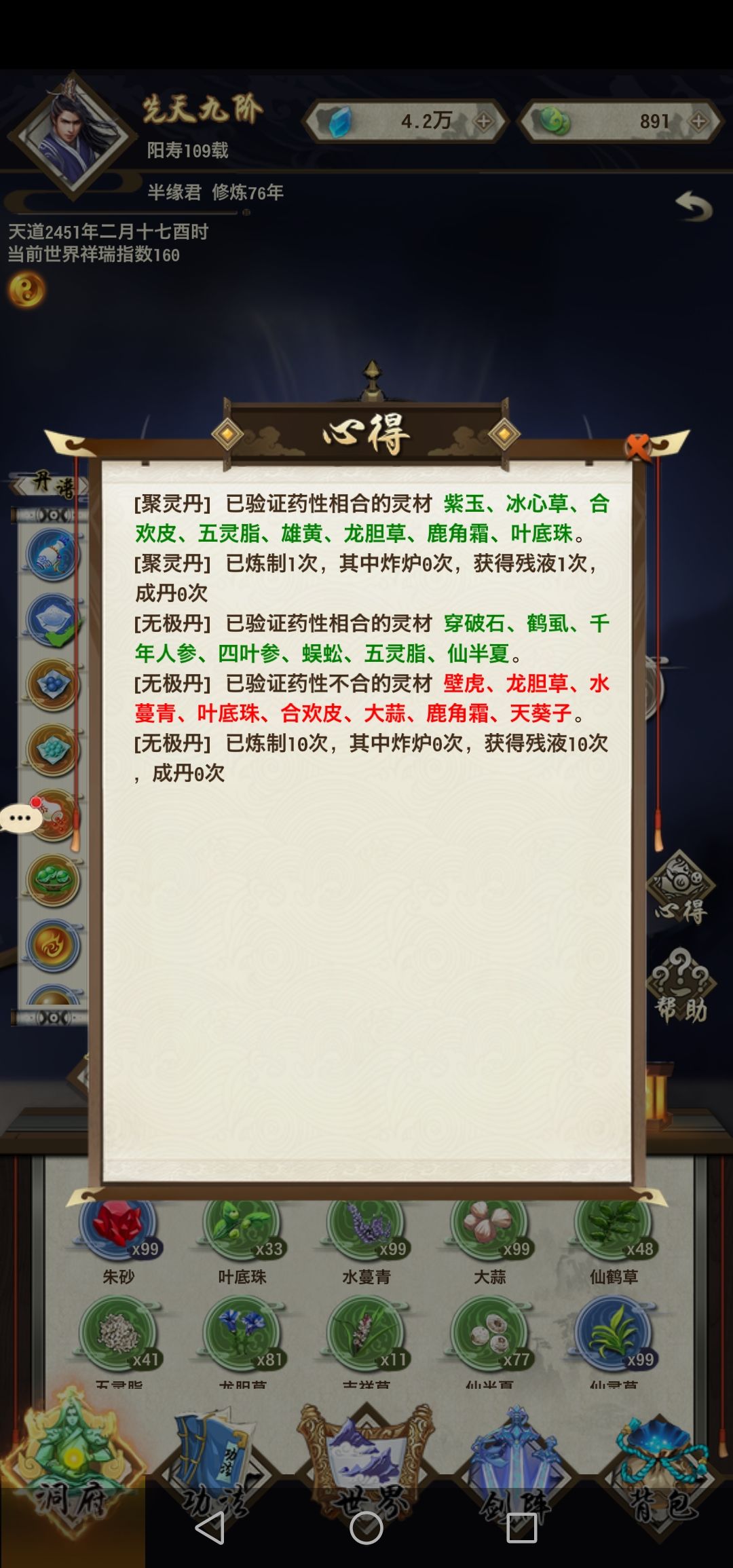 (ps:这边炼丹几个提醒点的话就是有基础材料的小伙伴最好用完整丹方炼成功率高,没有基础材料的小伙伴硬炼可以用单抽来炼,就是只用一种普通材料炼,虽然成功率低,但好处是没出丹不算太亏,出丹,就赚大发了嘿嘿(º﹃º ),特别是无极丹之类的珍惜丹药)