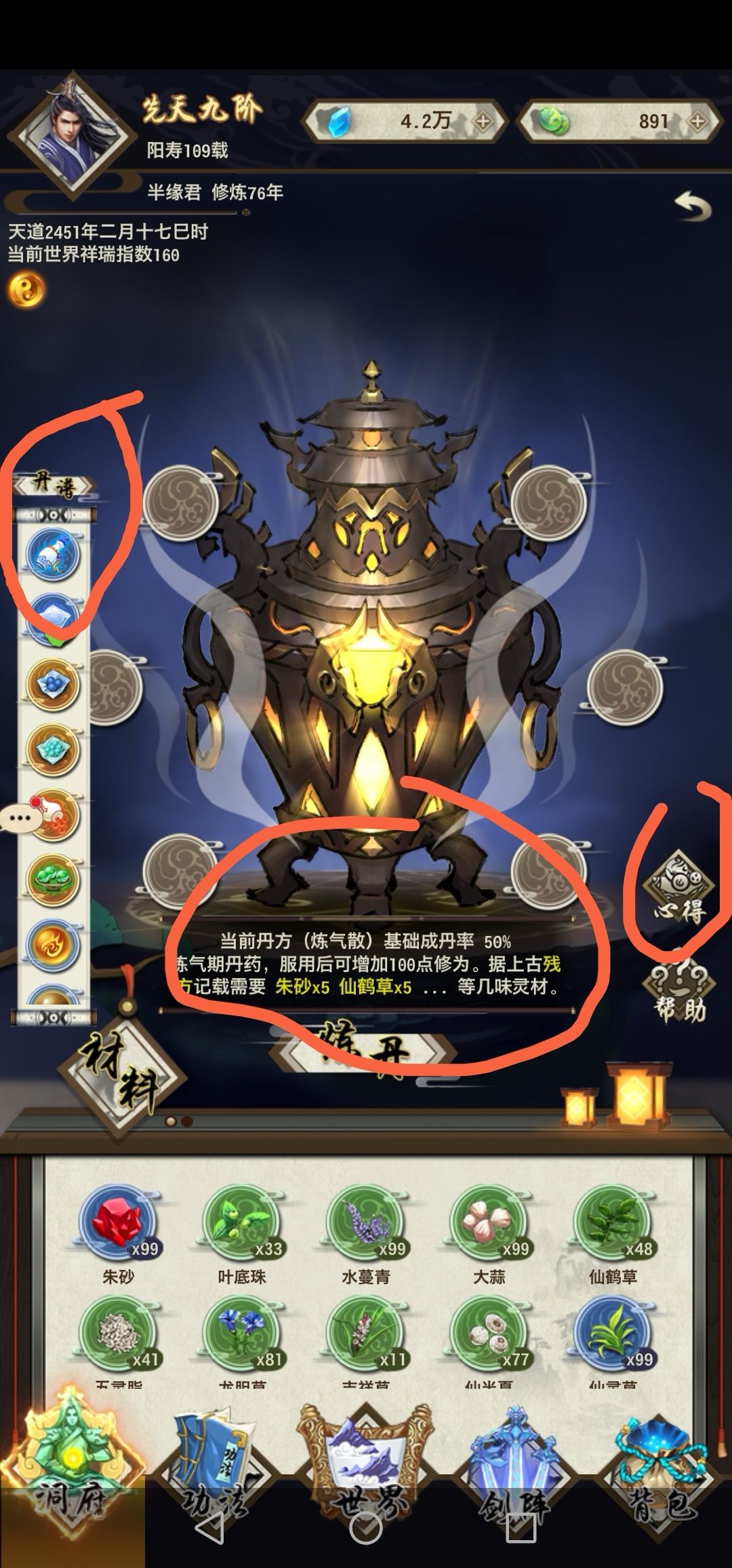 进入丹炉页面的话有三个重要的地方小伙伴们需要注意!