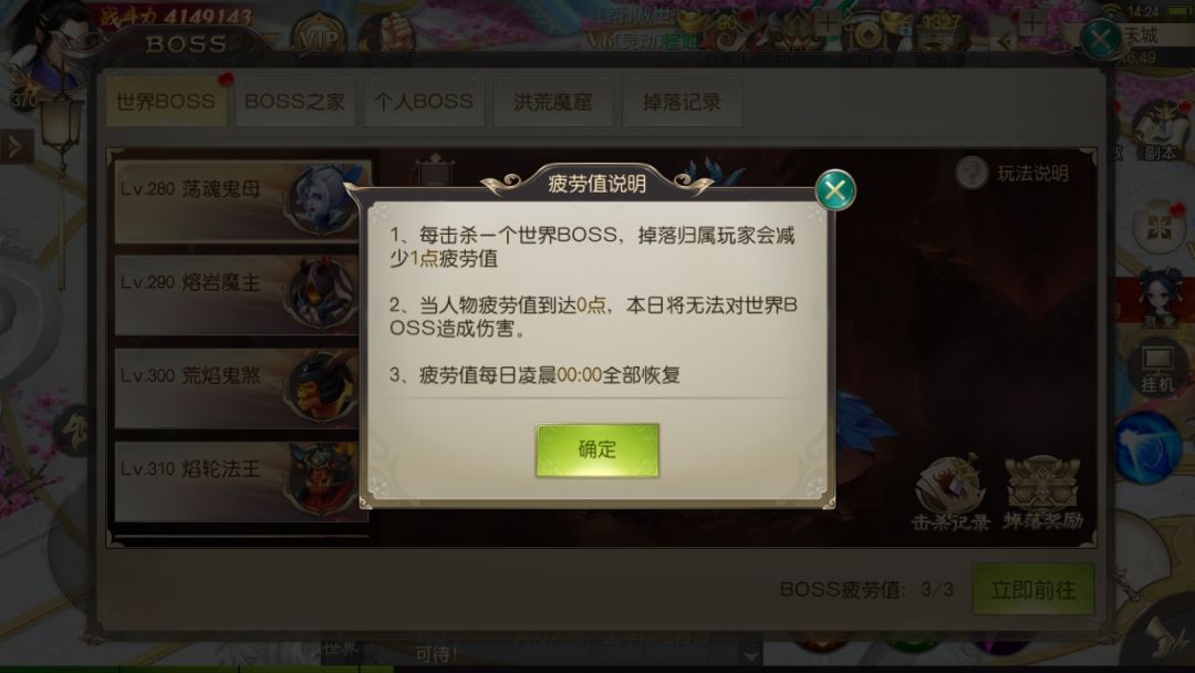 每天有3点疲劳值,每次击杀boss获得掉落道具都会消耗1点,疲劳值消耗完就不能再攻击世界boss,疲劳值在次日0点重置。