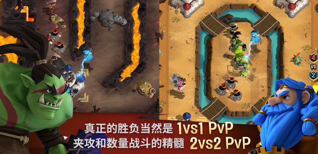 首先赋予以实时生产的资源(魔法值)和人口数的限制条件。用户选择自身专属的科技树生产兵力,通过和对方的战斗一决胜负。可狩猎在分出胜负的过程中出现的中立怪物,可将由此获得的法术使用于战略上从而可做出胜败的变数。同时不光有实时1对1 PvP还提供实时2对2PvP,关卡模式,每日挑战等各种内容。
