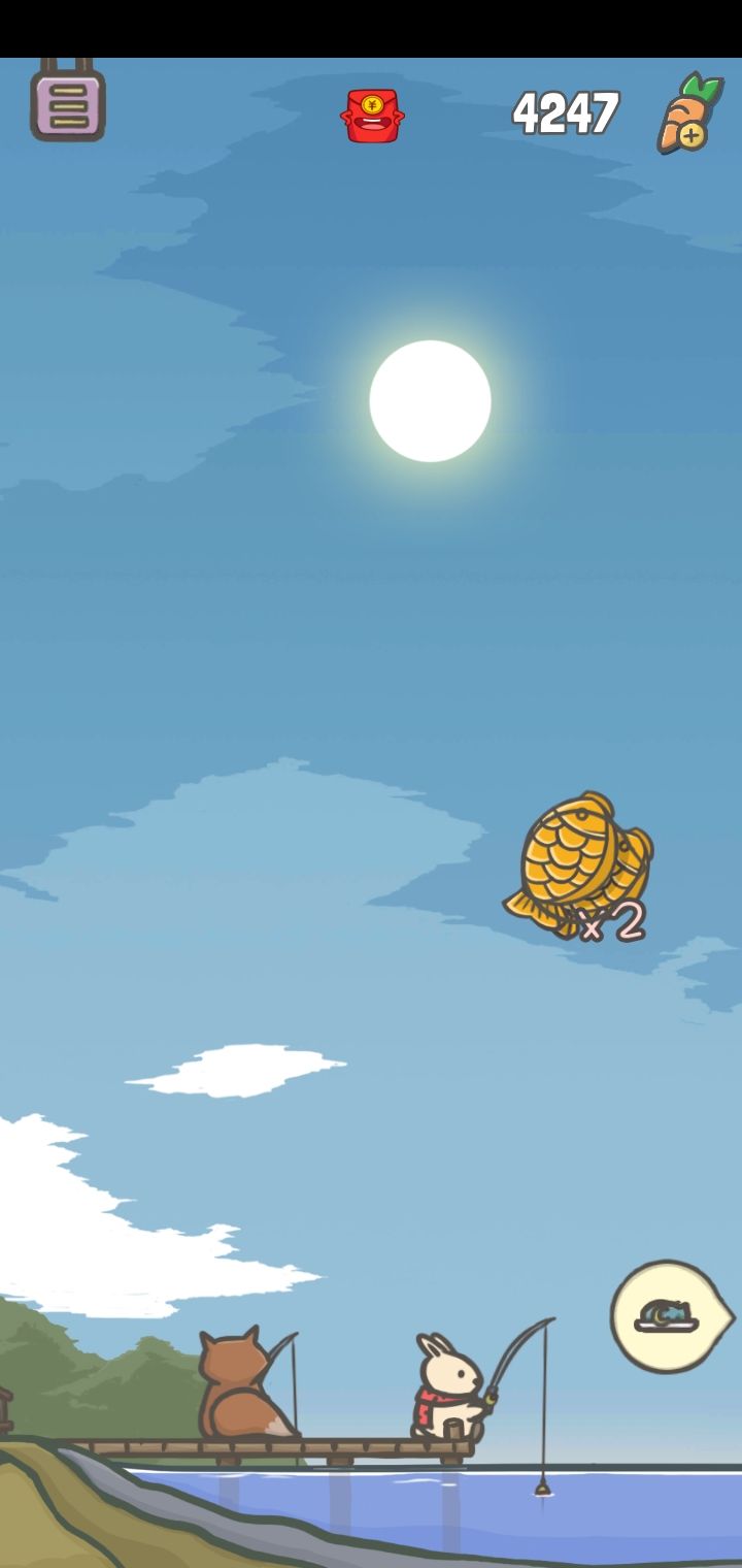 点一下鱼竿,使用物品,就可以钓鱼了。上面有一个鱼的标志,点它看广告,钓上来的鱼双倍,比较建议看看广告。