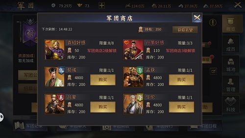 军团商店会出售各类道具和物品,例如:武将好感度、中级经验书、加速锤、神行丸,都可通过军团名望换取。军团名望可通过城池捐献、军团捐献、悬赏任务3种方式获得