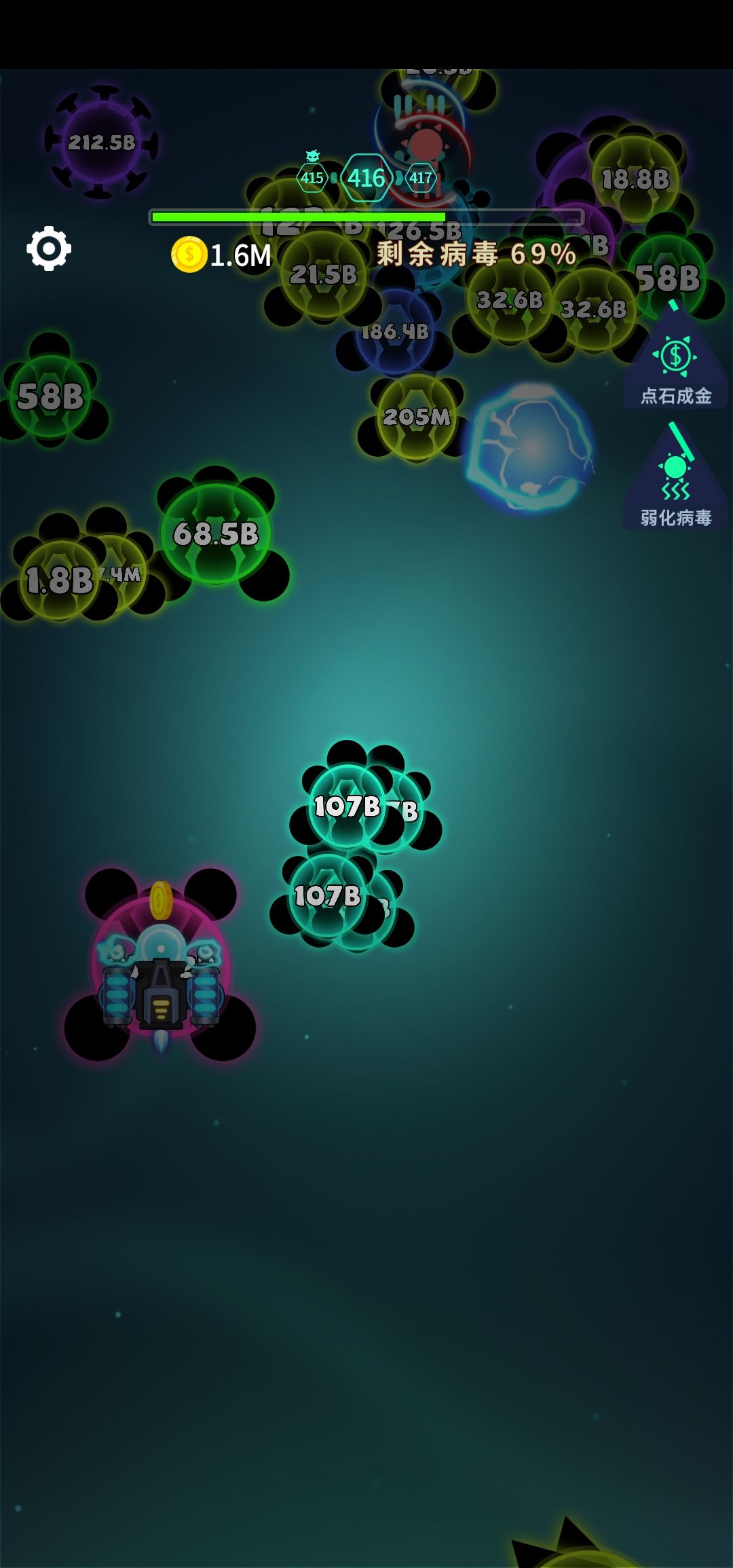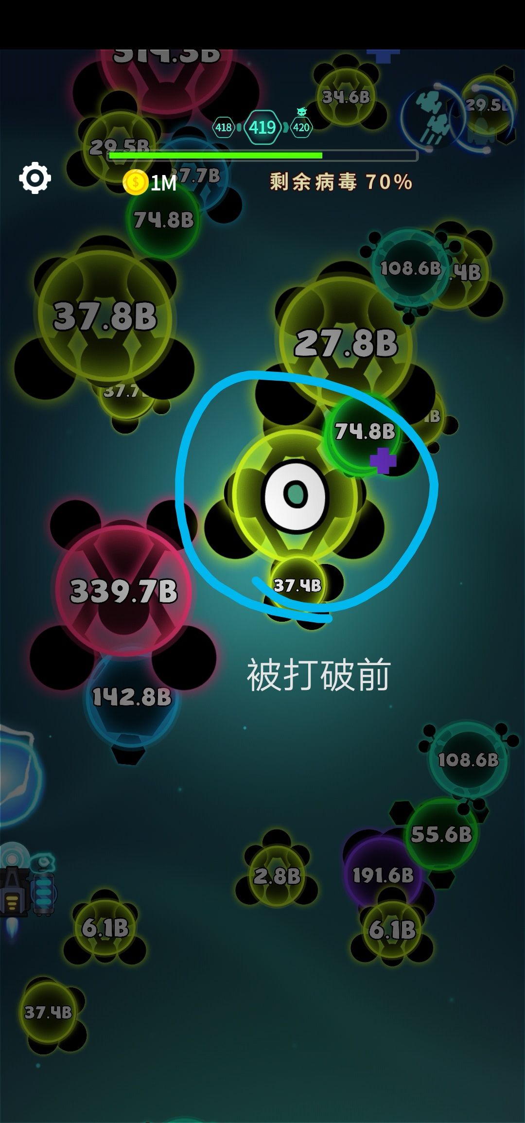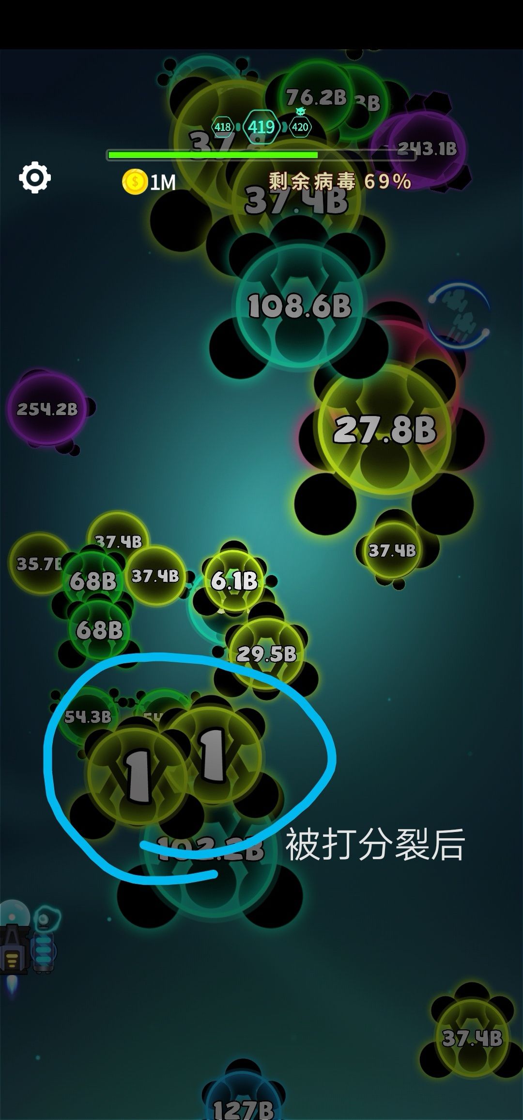在关卡中,击杀最小体积的病毒(蝌蚪例外暂不考虑)会掉落金币,一般每只掉落1~4个。该科技每提升1级,面板值+6。楼主目前为Lv450(2700)。按楼主的面板值,击杀病毒每获得1个金币,关卡内的金币池💰+2700,击杀一个小病毒获得3个金币,💰+8100=0.81k。这项科技点上去是非常划算的。楼主目前在419关,为同化病毒刷钱关(版本V1.4.4),一把能稳定4M以上,有时点石成金多了能有10M以上(未计算广告倍数)。