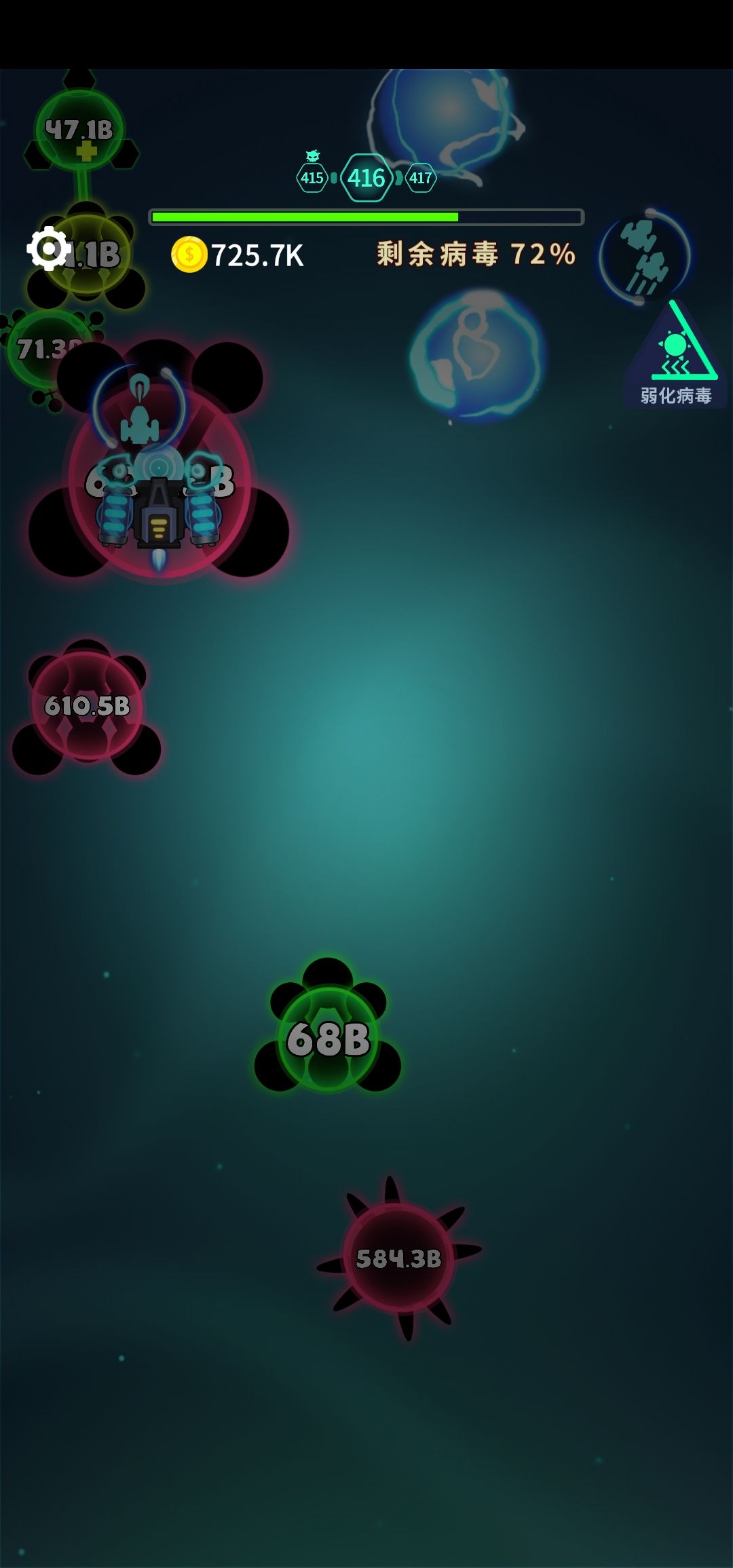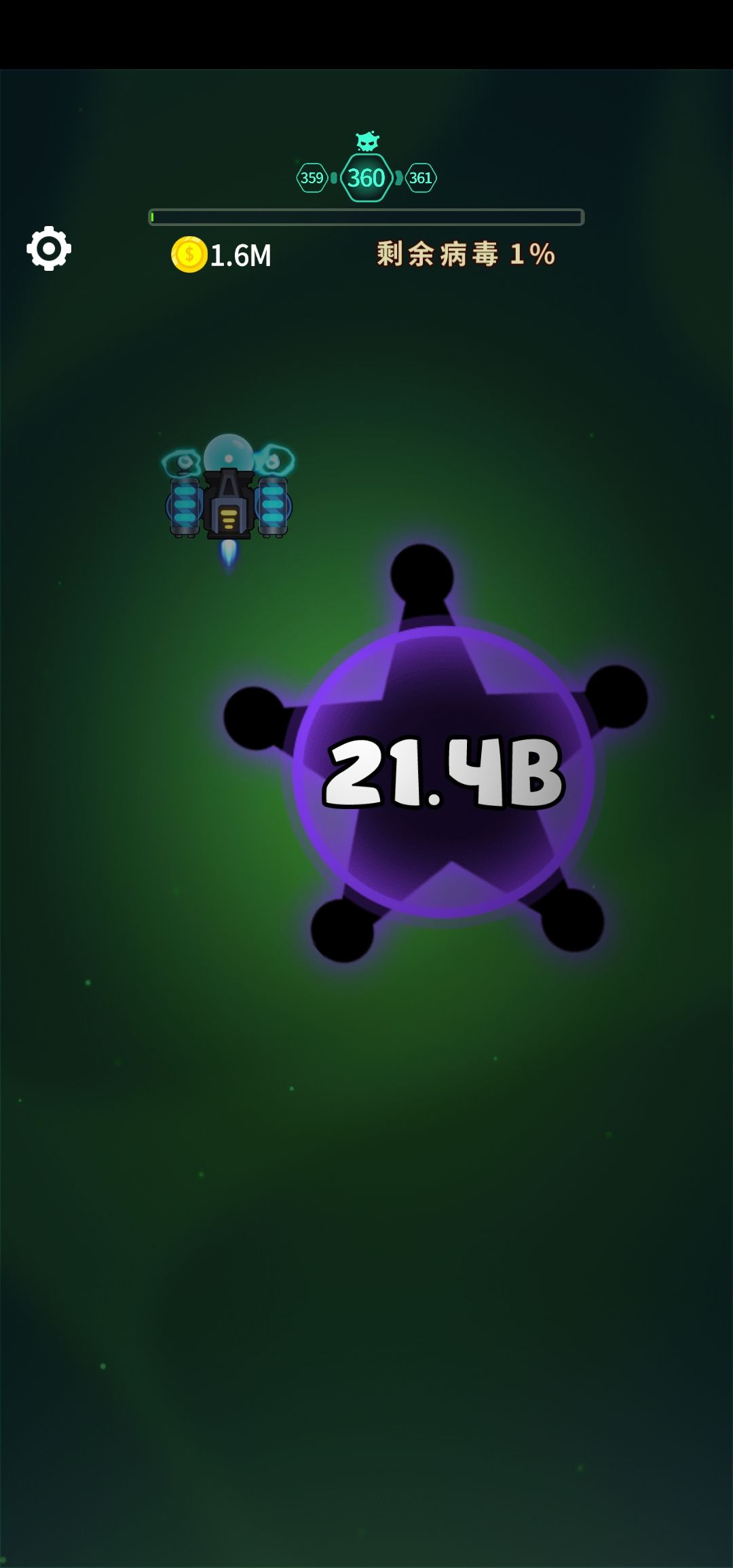 以最小体积为1级病毒,再大点就2级(2级可分裂成2/3只1级),以此类推,最大boss体积为5级。(巨化病毒相当于把所有病毒尺寸翻倍,即变大1级,此时最小体积为2级)