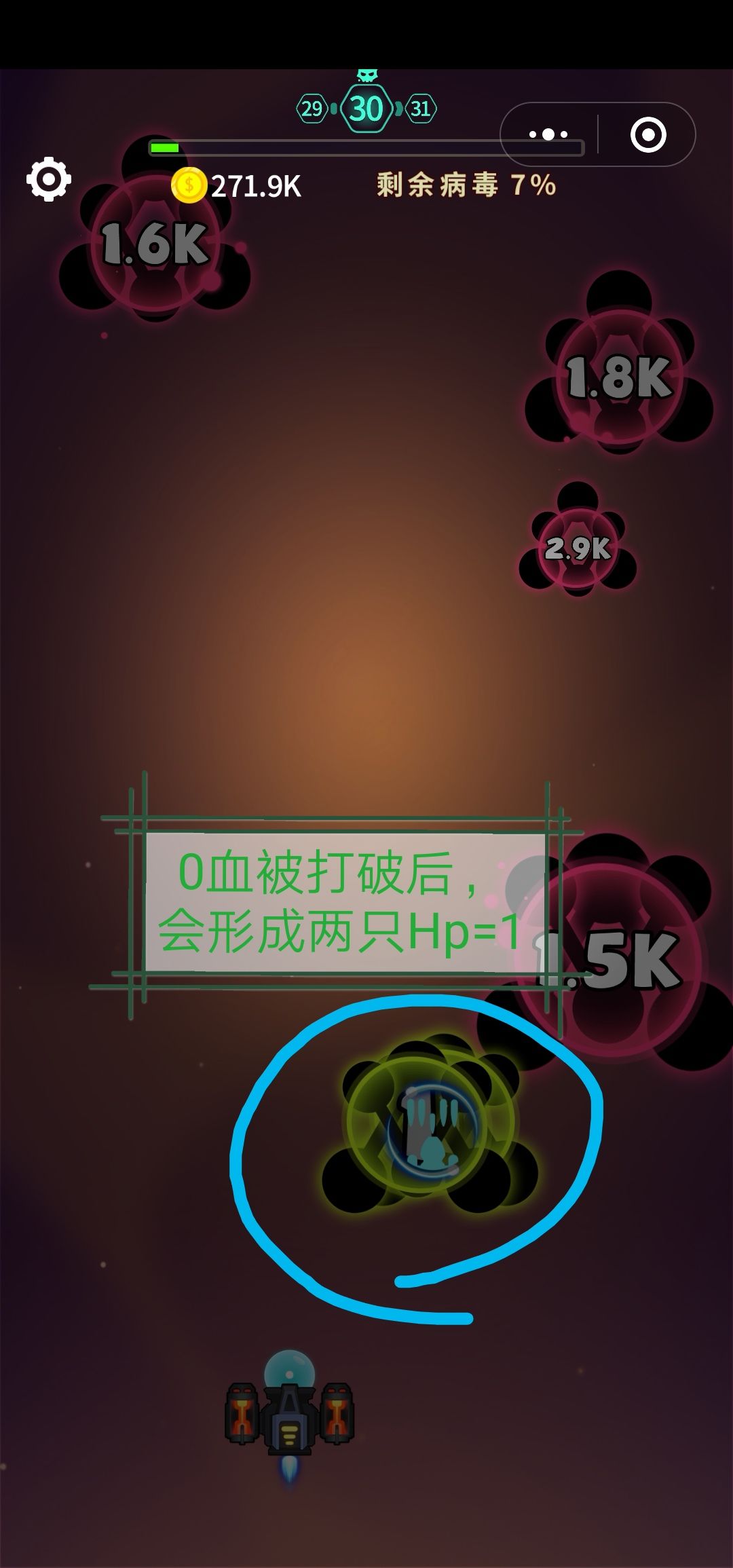 三分病毒被打爆时能分裂出3只,在boss关见到Ta,说明接下来5关都是刷钱关噢~