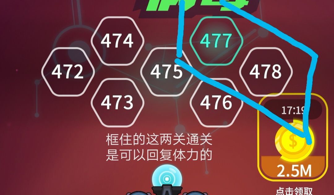 不少小伙伴也开始了卡关刷钱,但是总是遇到过关不会回复体力的问题,并且当前版本已经无法通过广告回复体力了,体力成了刷钱最大的障碍。实际上,在上图中,框住的两个关卡只要过关是可以回复体力的,一个为当前关,另一个为上个通关关卡。比如楼主选择了477关作为刷钱关卡,选择477关>通关477关>回复体力>选关跳回477关……,除了偶尔意外翻车损失体力,几乎就是永动机啊!(不说了楼主肝疼,先前【金币价值】Lv450硬生生被楼主肝毕业了)。另外,配合电锯来刷钱确实是一个不错的选择噢~