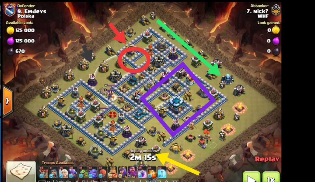 红色剪头:天女 ,黑色箭头:龙宝清边 ,绿色剪头:蛮王清边路线,红色区域:地震法术范围,紫色区域:矿工走廊与永王援兵大气球,黄色剪头:闰土与冰人清边