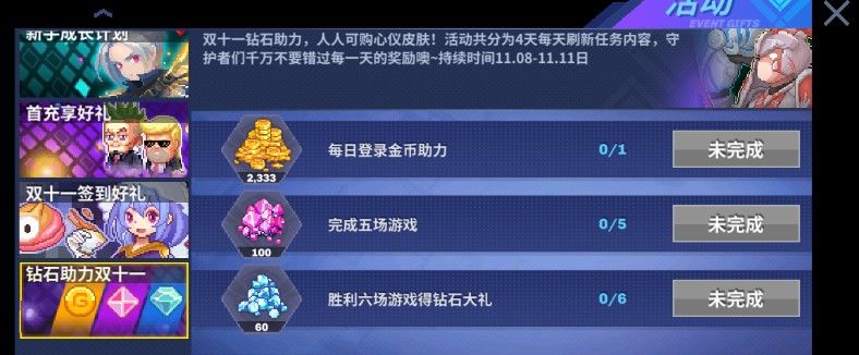 二:钻石助力!双十一钻石助力,人人可购心仪皮肤!活动共分为4天每天刷新任务内容,守护者们千万不要错过每一天的奖励噢~持续时间11.08-11.11,错过再等一年啦!