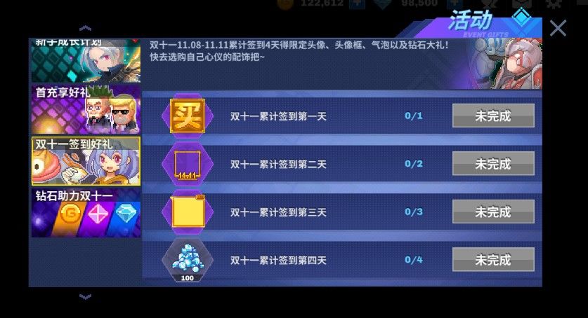 三:双十一好礼!双十一活动期间,11.08-11.11日期间,累计签到4天得限定头像、头像框、气泡以及钻石大礼!快去选择自己心仪的配饰吧~