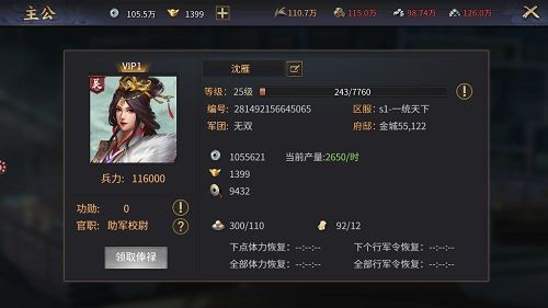 游戏界面左上角有当前行军令和体力值行军令上限的数值。在主城界面点击左上角主公头像,可以在打开的主公界面查看行军令恢复的具体时间。