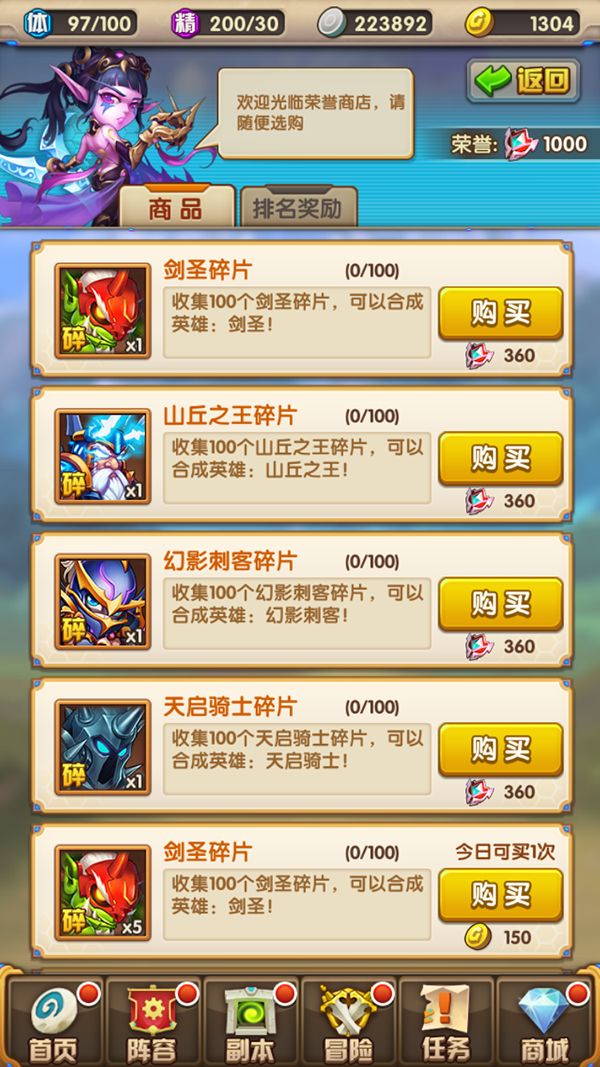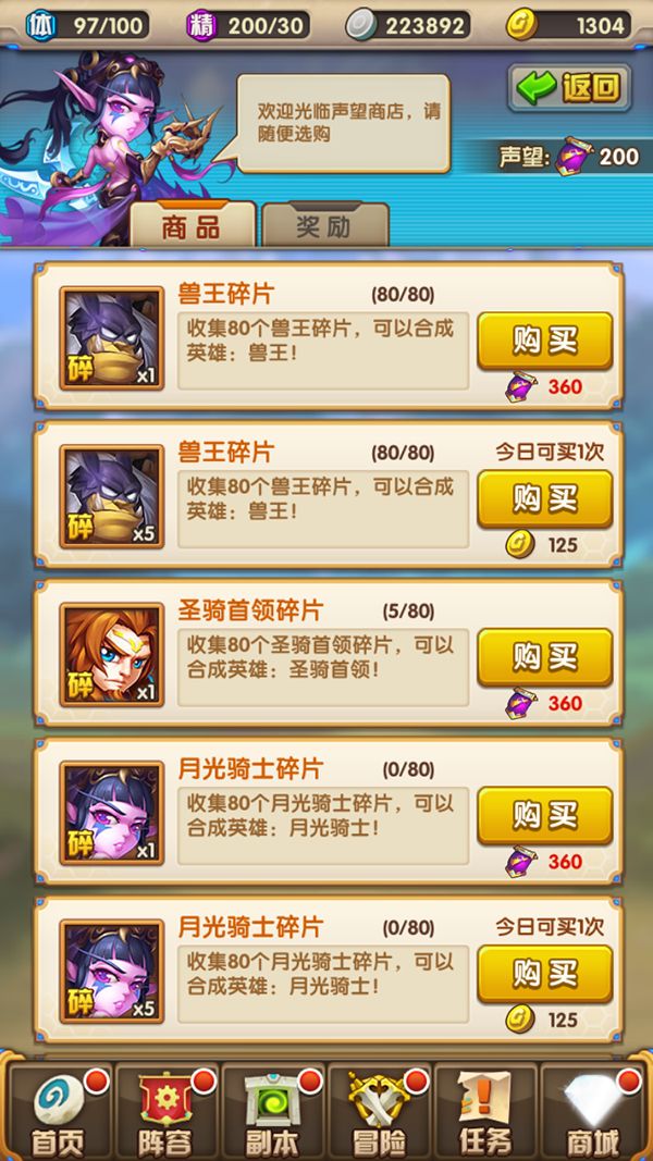 而在声望商店中,玩家可以花费声望,购买所需要的资源以及英雄碎片。