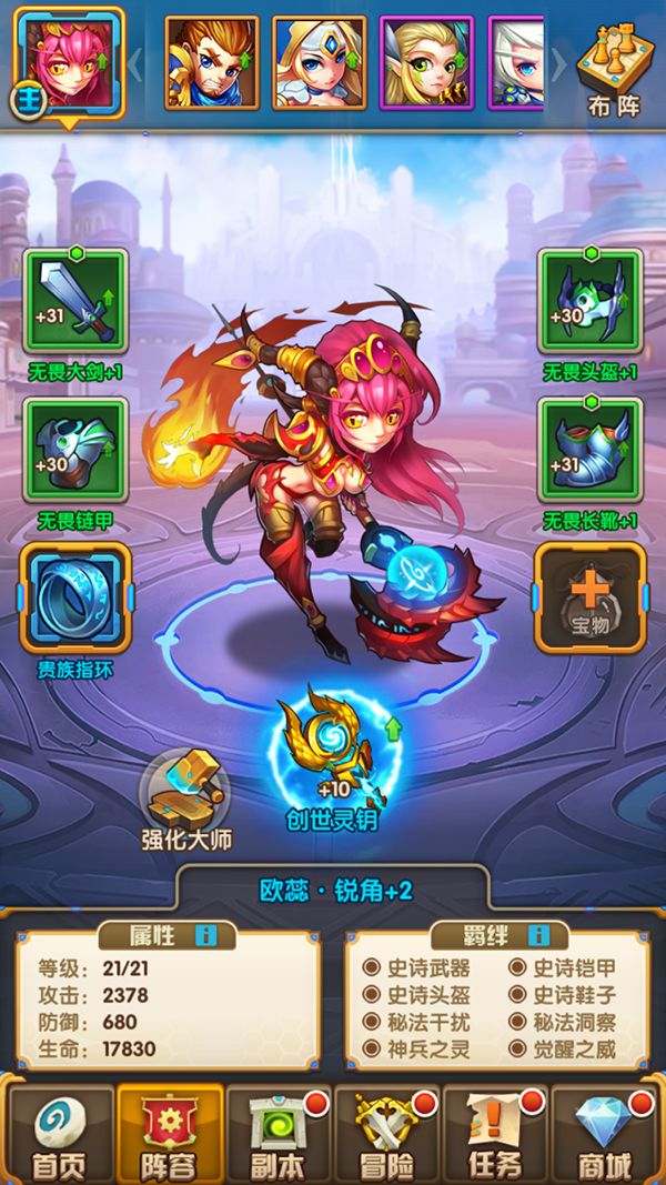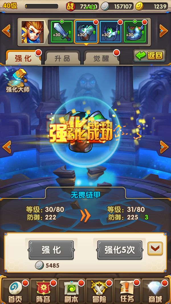 顾名思义,强化就是打磨你的武器。强化可以使你的武器基础属性获得线性提升,并且几乎是游戏中最直接的提高战斗力的方式了。而且强化的武器使可以替换给其他英雄使用的,你可以放心大胆的强化装备而不必担心过渡英雄会消耗你的资源了。