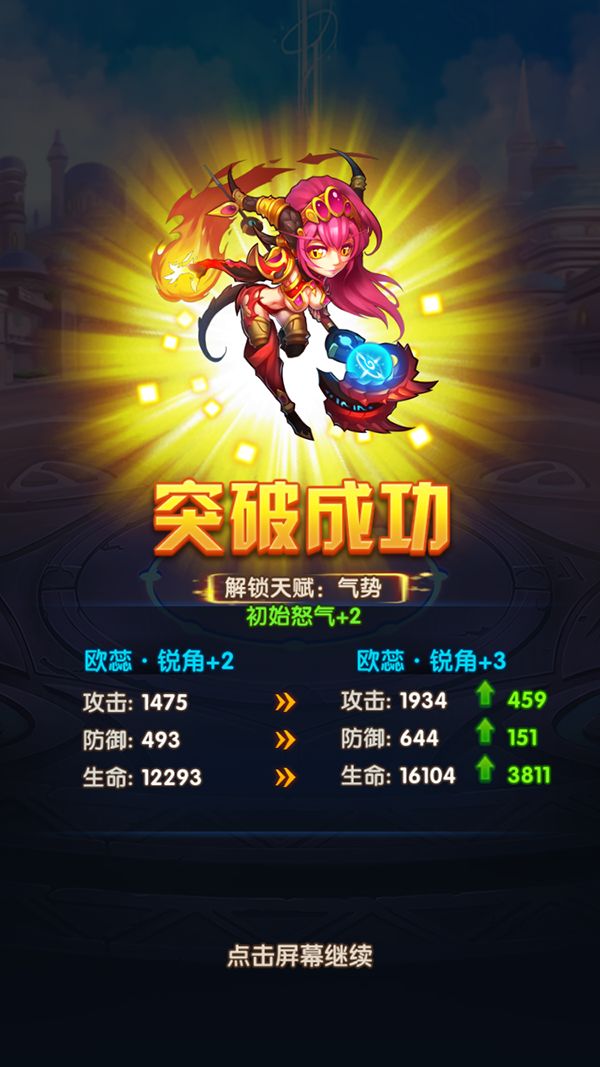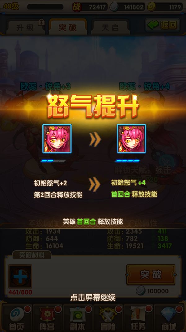 突破主角与英雄角色达到一定等级后,便可以进行突破。突破不仅会使主角、英雄的属性大幅提升,还会解锁天赋。特别是当角色达到突破+3时,会解锁【初始怒气+2】的战吼天赋,配合神器的天赋效果,角色便可开场释放大招,有着非常关键的战术意义。