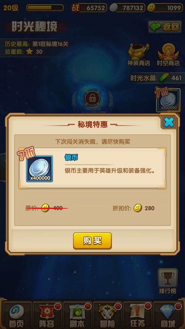 不小心闯关失败了?没关系,无论是否击败秘境中的所有敌人,只要完成一次秘境,就会刷新一次秘境特惠商品,特价优惠,不要错过哦~