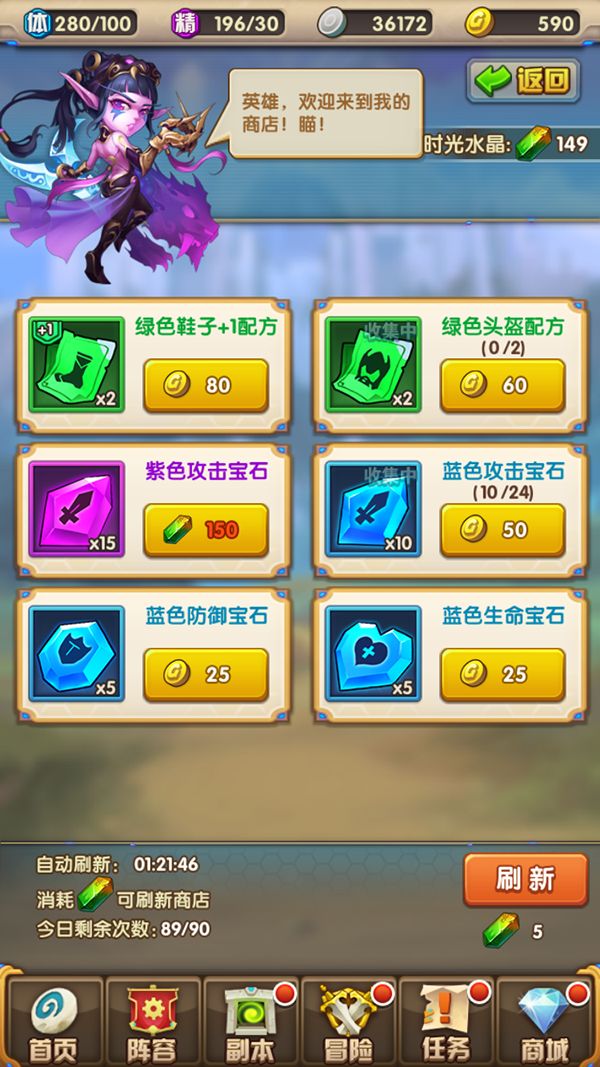 时空商店每隔一段时间会自动刷新商品,玩家也可以消耗时光水晶或金币手动刷新。