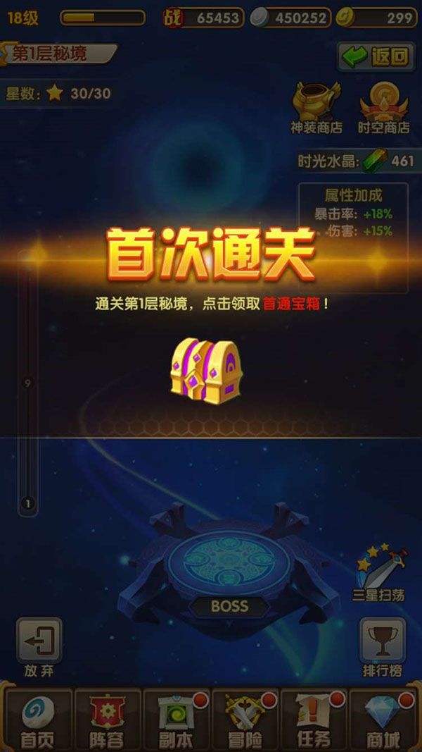 终于击败时光秘境的最终BOSS(第一层)啦~!通关一层时光秘境后,会有一个超级大宝箱以及其他通关奖励等着你哦,赶紧提高战力,来挑战时光秘境吧!