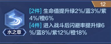 水之章:水代表着连绵不断、代表着长久永存,所以水之章的2件触发属性为生命值提升百分比(蓝、紫、橙百分比不同),四件触发属性为进入战斗后闪避率提升百分比,那么这个徽章从2.4套装属性来看就是为一些肉盾和闪避属性居高的角色量身搭配,在当前大坏境是一波流崛起和闪避属性不起眼的情况下此徽章的用处比较鸡肋,目前只能装备在前排的身上。