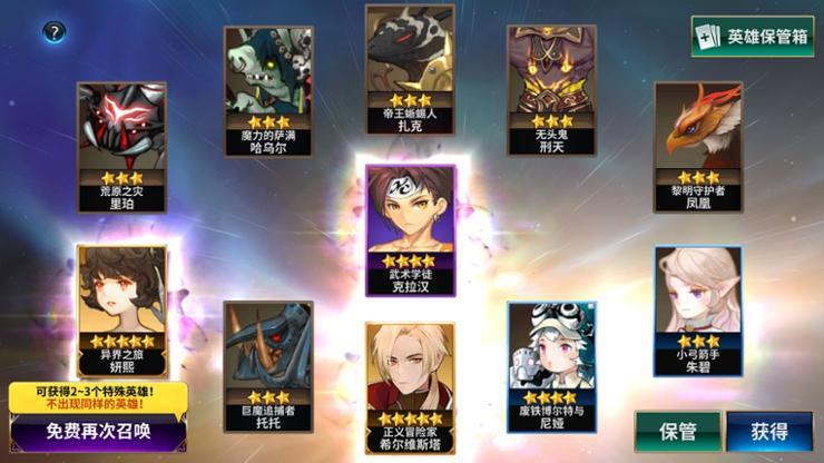 这次所有新玩家仍然享有无限抽卡的超级buff,在首次十连召唤英雄时可无限次“抽卡”,每次都会有抽到2~3名不重复的特殊英雄,百分百可以选定你喜欢的英雄。骑士们启程时可以非常轻松地收集到自己最爱的本命英雄,愉快地展开这段奇幻冒险。