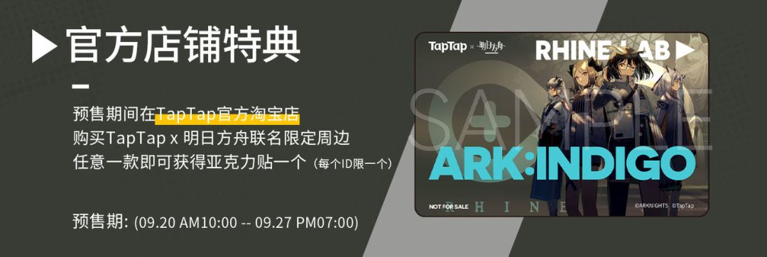1、预售期间,在 TapTap 店铺购买任意一款 “TapTap x 明日方舟” 联名周边即可获得限时店铺特典一份。