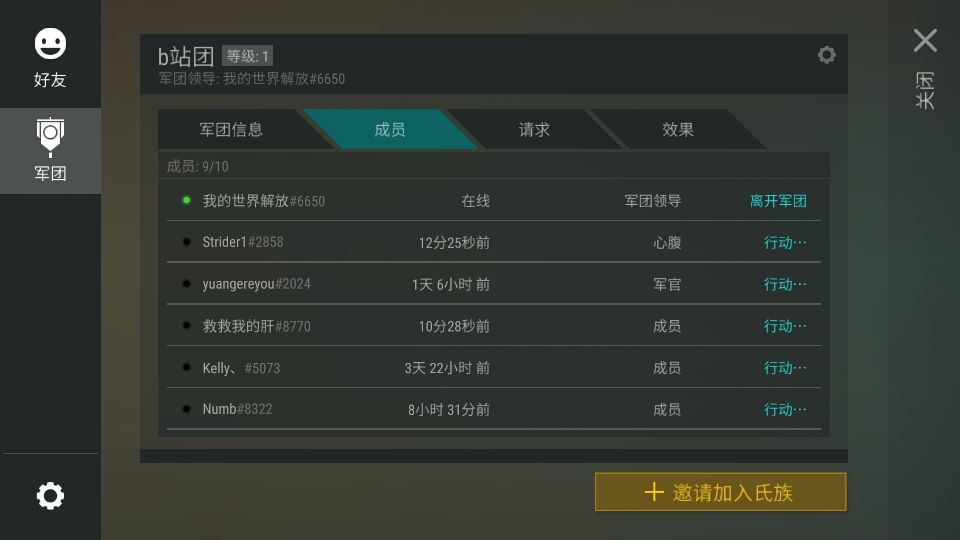 军团收人要求经常网速好点可以一起打boss(负责担任工具人拿我们的乱七八糟的武器)余额剩下一人谁来啊(没死鱼!)