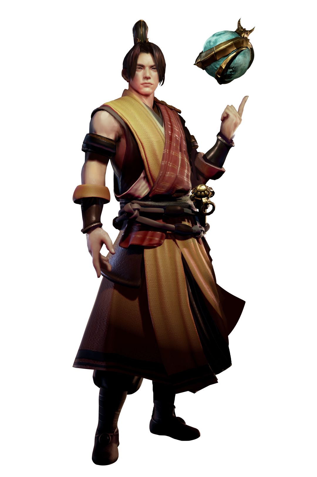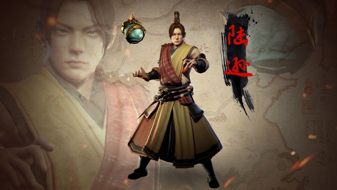 陆逊从空中跃向地面,以宝珠拖拽击打敌方。