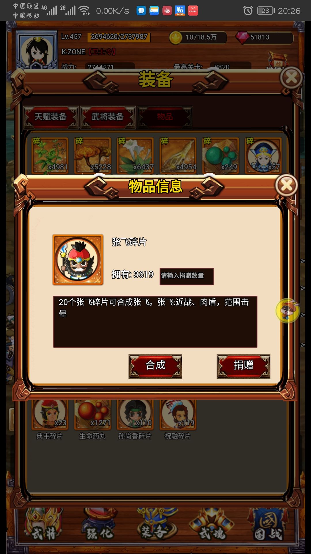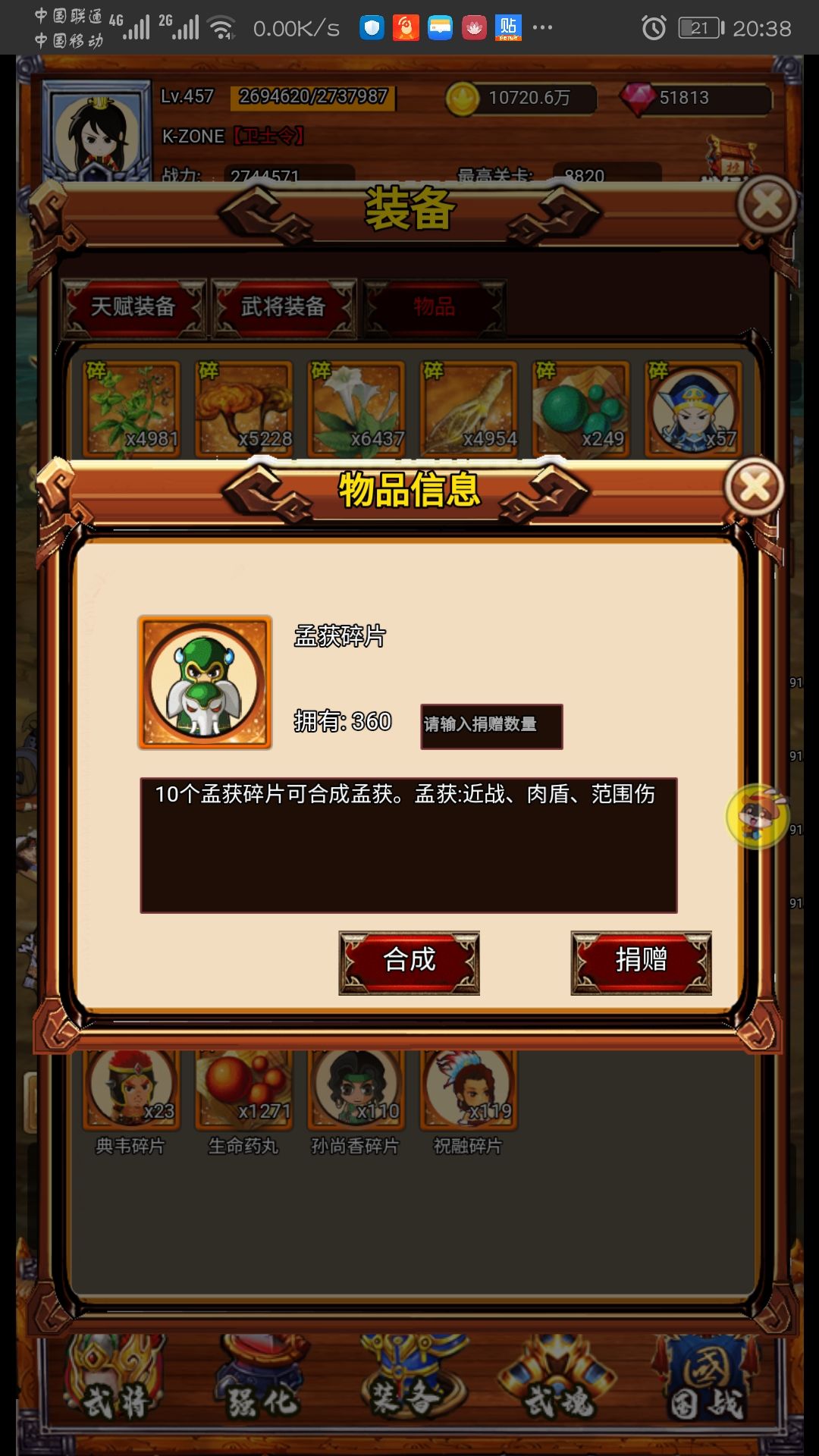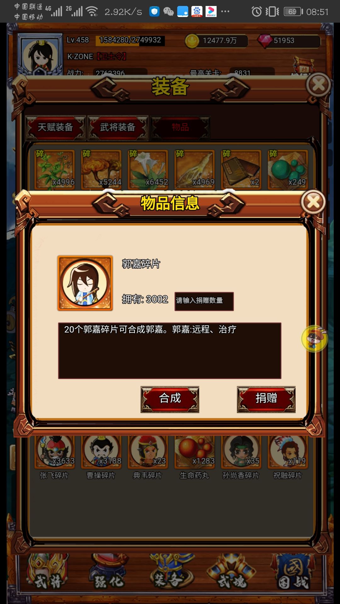 除了系统赠送的体验装和签到第二天的郭嘉,就通过武将宝箱开出和武将碎片合成了。