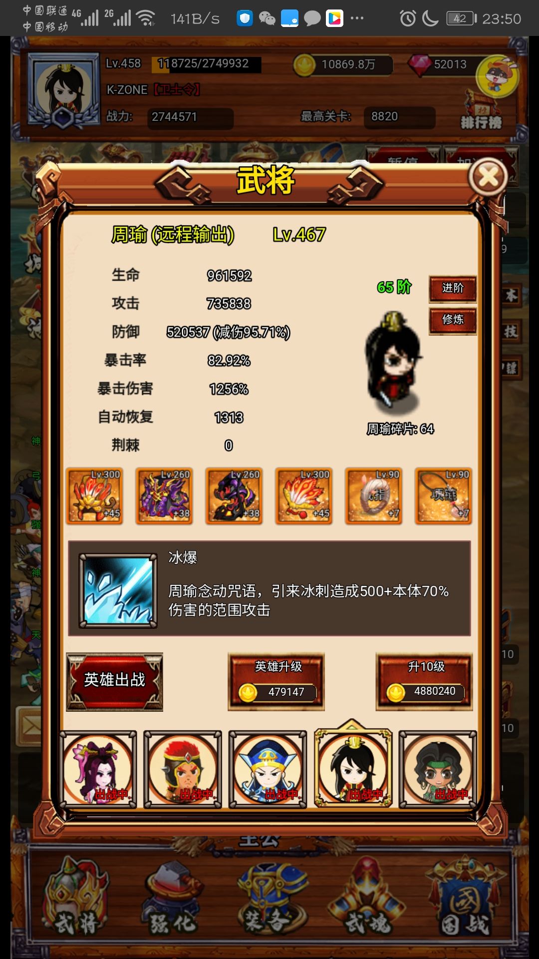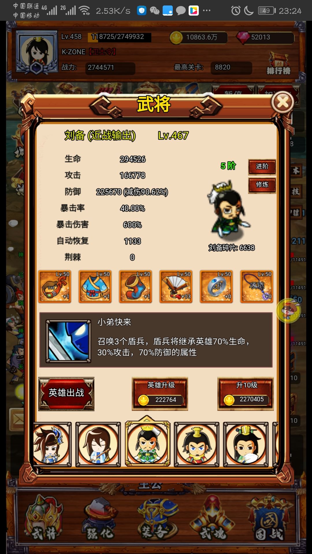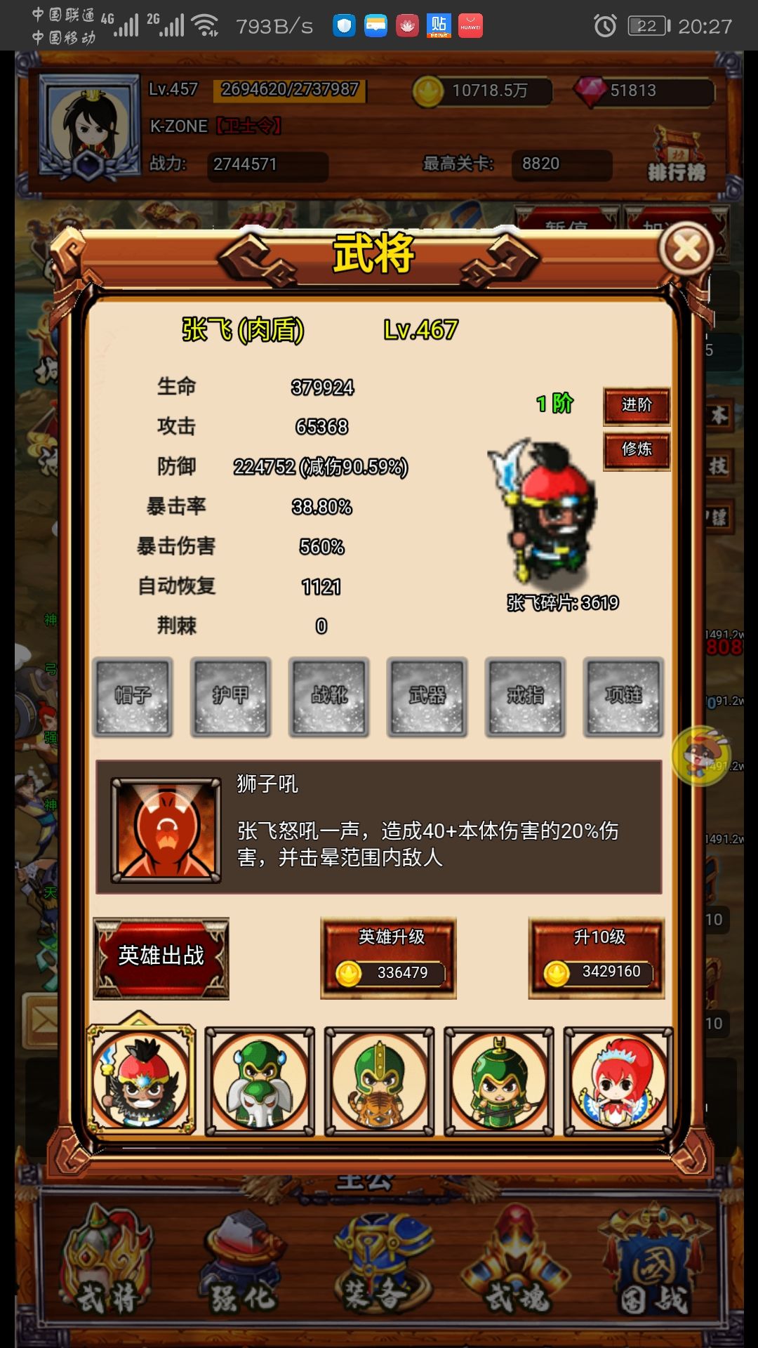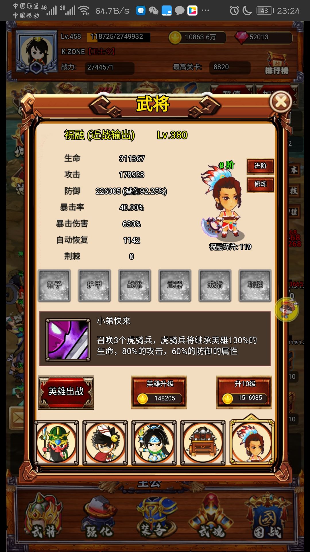 小结:肉盾除了太史慈到目前我还有用,其他的都是放仓库了,肉盾大多数都是用在前中期,到了后期你根本没法防住多少波,而且推图关键还是看攻击力,最好的防守就是进攻,所以肉方面除了太史,其他不需要投入太多。