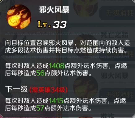 洛基的二技能邪火风暴是洛基的常用范围伤害技能,伤害数值随着等级的提升而提高