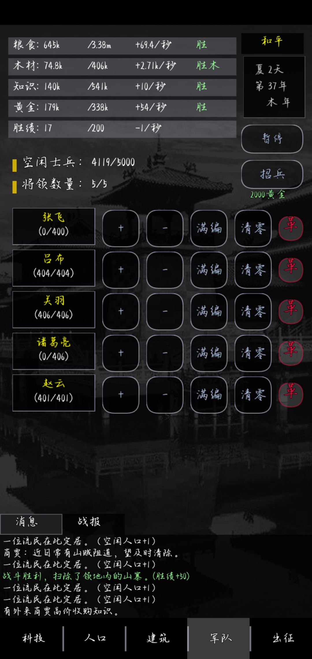 今天刚开始玩,前一小时看攻略找技巧,之后稳稳发展到10年,出三个紫将,之后酒馆升到5,出个金,15年之后大力发展军事就能平步青云,畅通无阻,稳稳通关