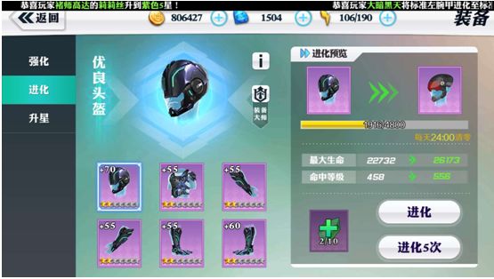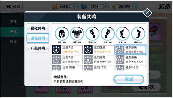 最后装备进化到一定等级,会产生装备进化共鸣,增加自身的属性