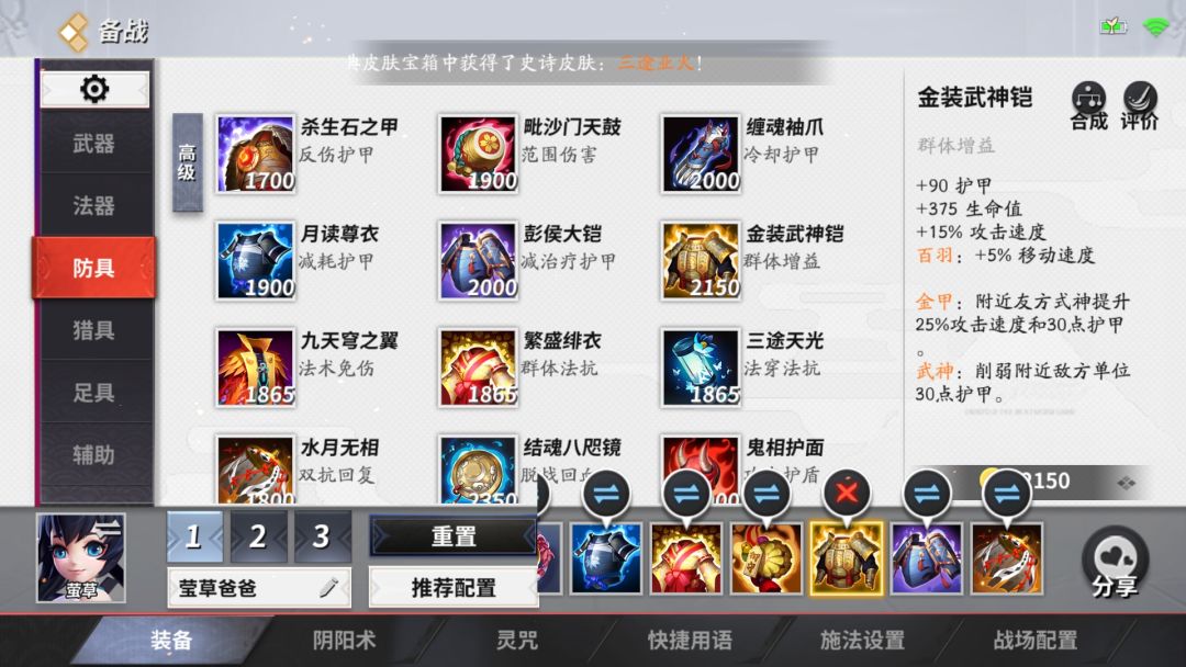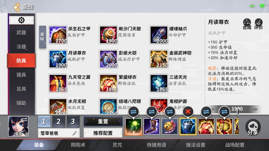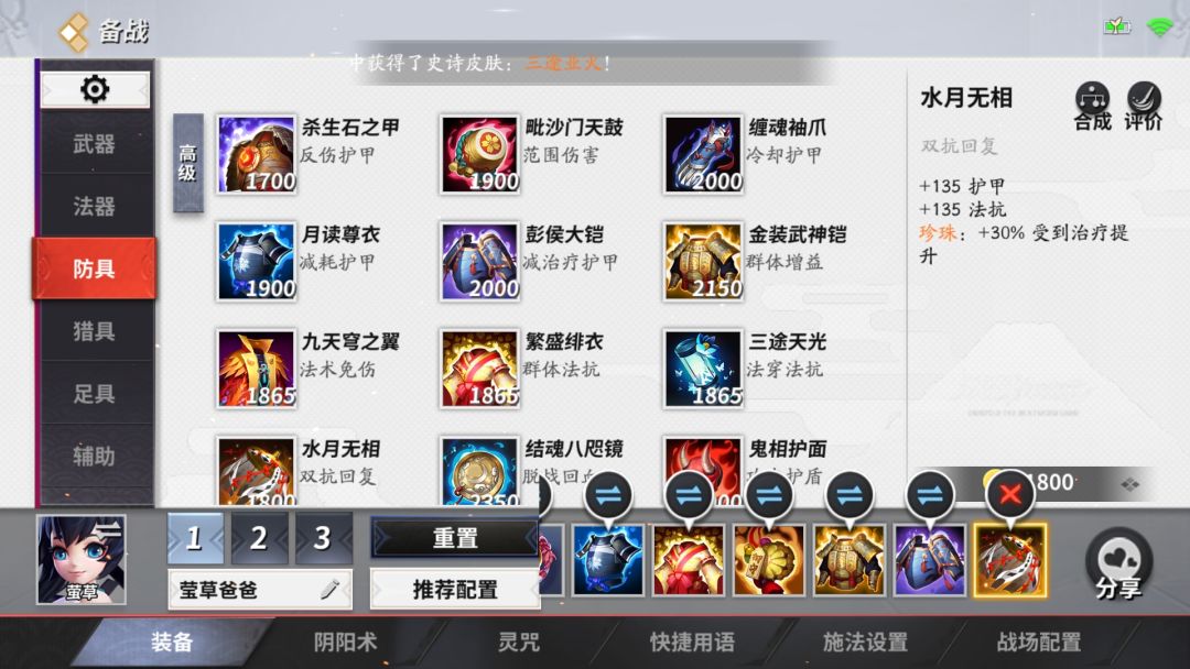 有时敌方ap输出偏高,比方说跳妹或者荒川之主上单,扛不住,相对来说出金装武神铠性价比就很低,这时候我们可以补充魔抗装备,这时候摸出一件魔抗装无疑是最好的选择,此装备双重抗性兼恢复能力加强非常适合。其实此装备可以换成其他装备比如说九天穹之翼,三途天光,结魂八咫镜,在优势的时候可以换成法强装备。