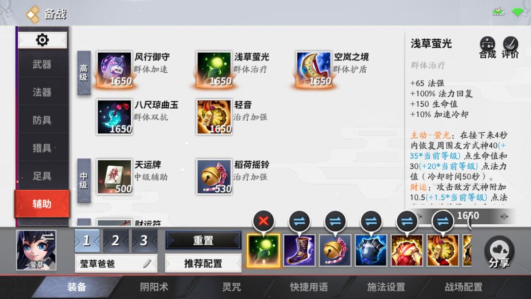加生命值,加冷却,加法强,主动范围回血又回蓝的辅助装特别适合莹草爸爸,莹草爸爸前期特别却蓝,这件装备可以让莹草爸爸续航能力加强一大截,无论战斗中或者战斗以外使用性价比都很高