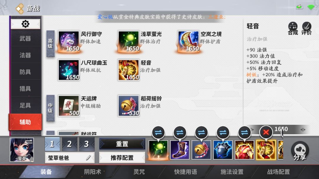 在前期莹草爸爸的生存能力还是很强的,如图可以在出了战靴后补一个铃铛,铃铛是合成轻音的小件,有增加治疗能力的作用,如虎添翼。轻音属于增益装备,敌方在面对莹草爸爸时会出重伤装备,轻音加法强和加强治疗能力,这时补出一个轻音可以进一步增加回复能力。