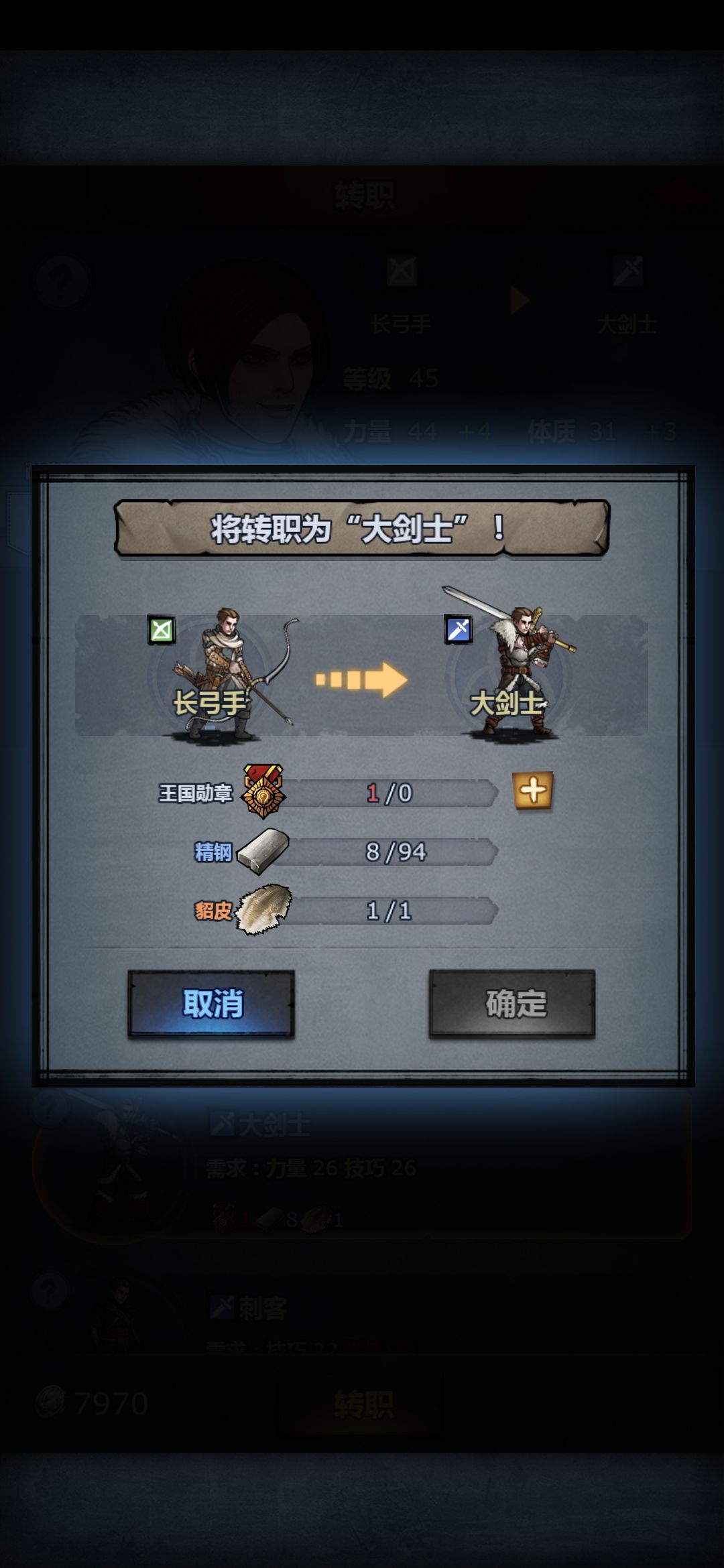 2. 25级学到狩猎技能,29级不能转大剑士,因为力量差1点。如果有人觉得没关系的,可以继续升级等力量够了再转大剑士