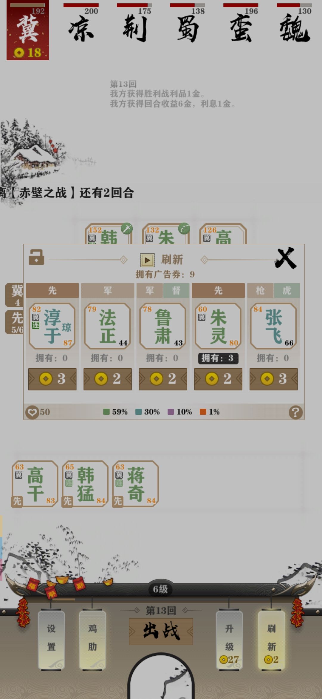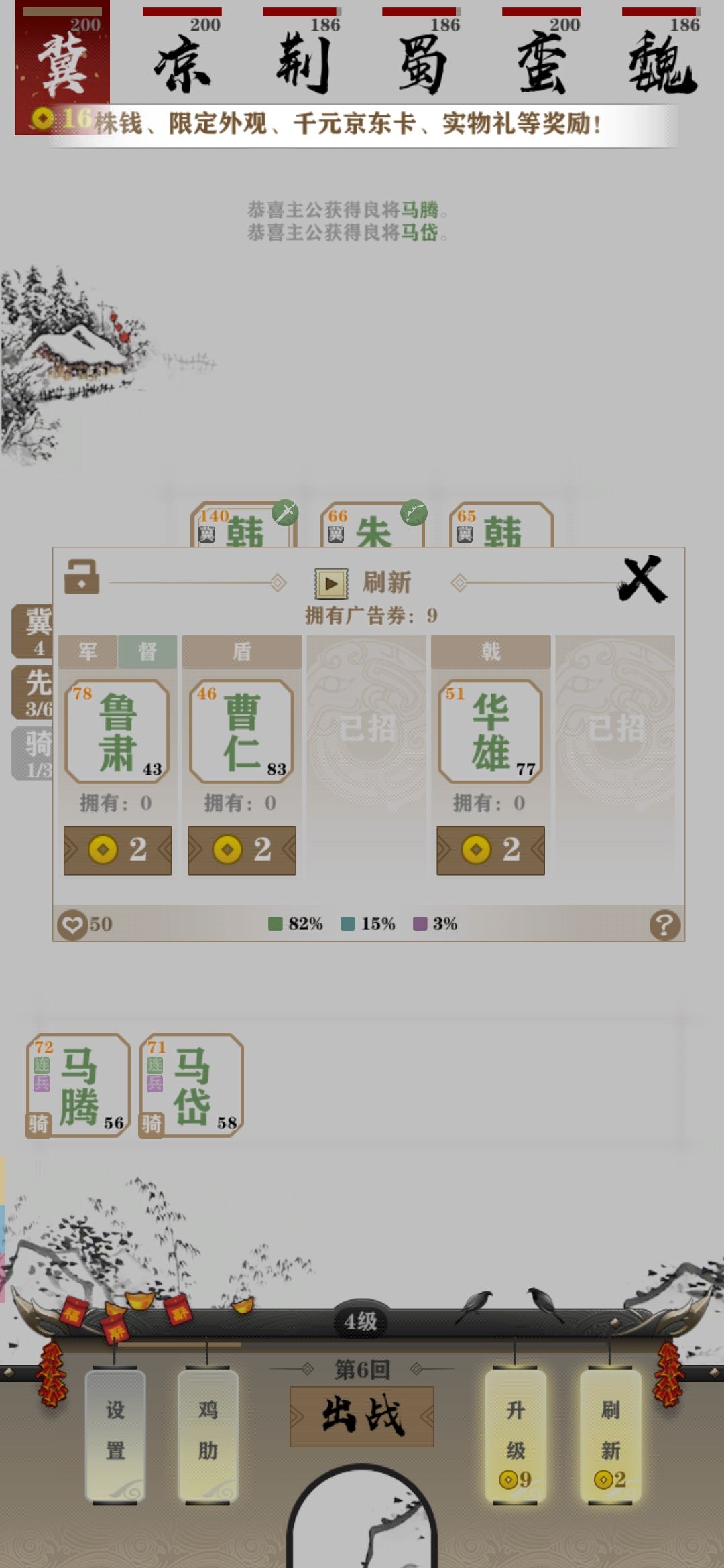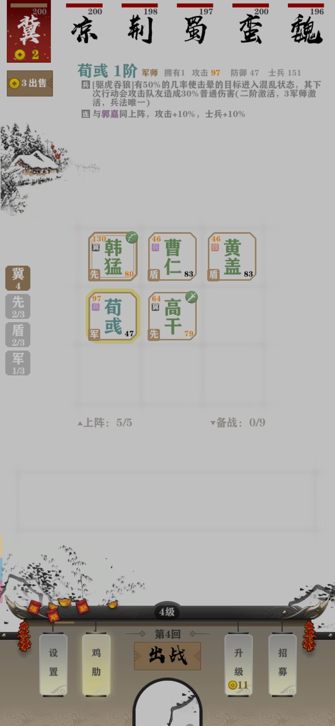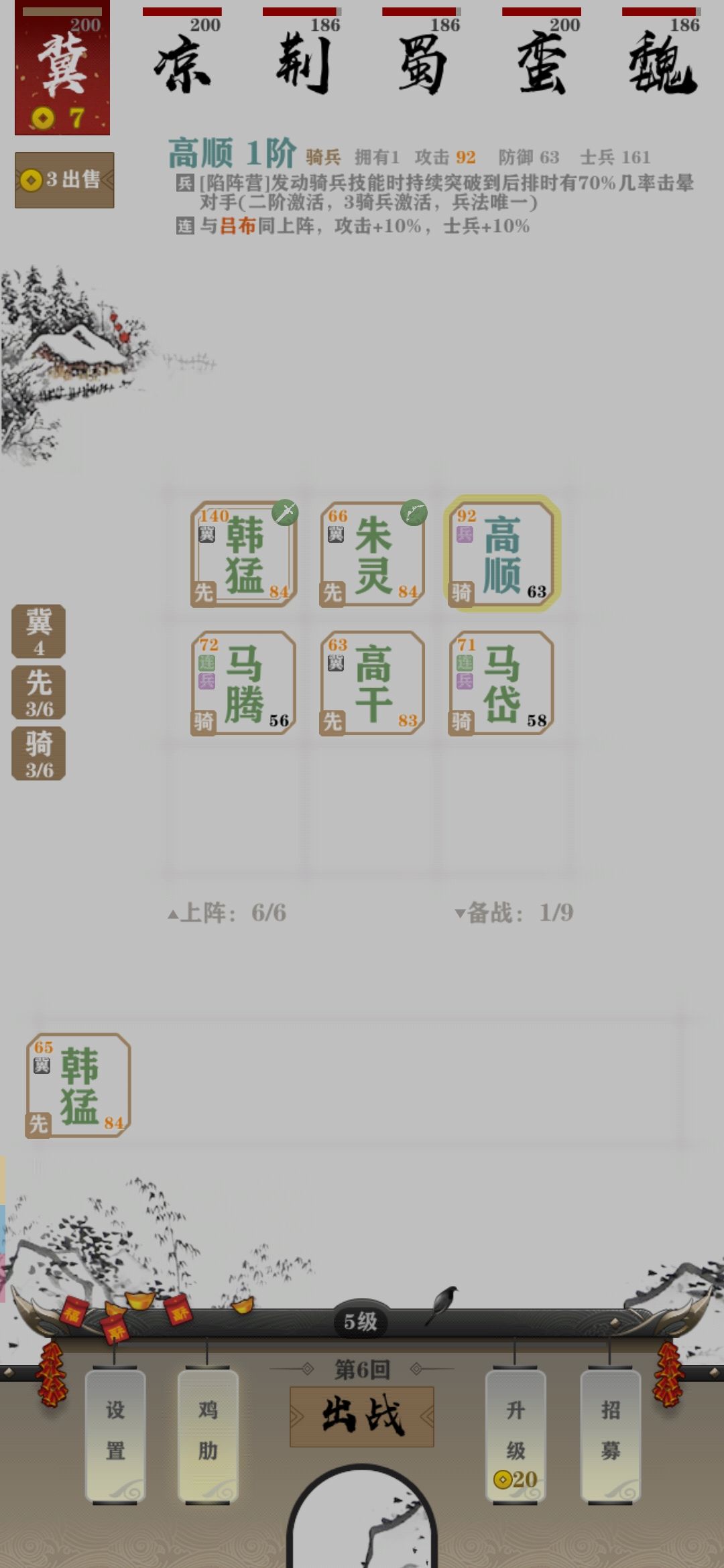 我没这运气,老实拿打工仔,这个骑兵羁绊基本就是好看没用,脸黑也没出高品质的将,这战力基本拉胯,下回合之前全卖。