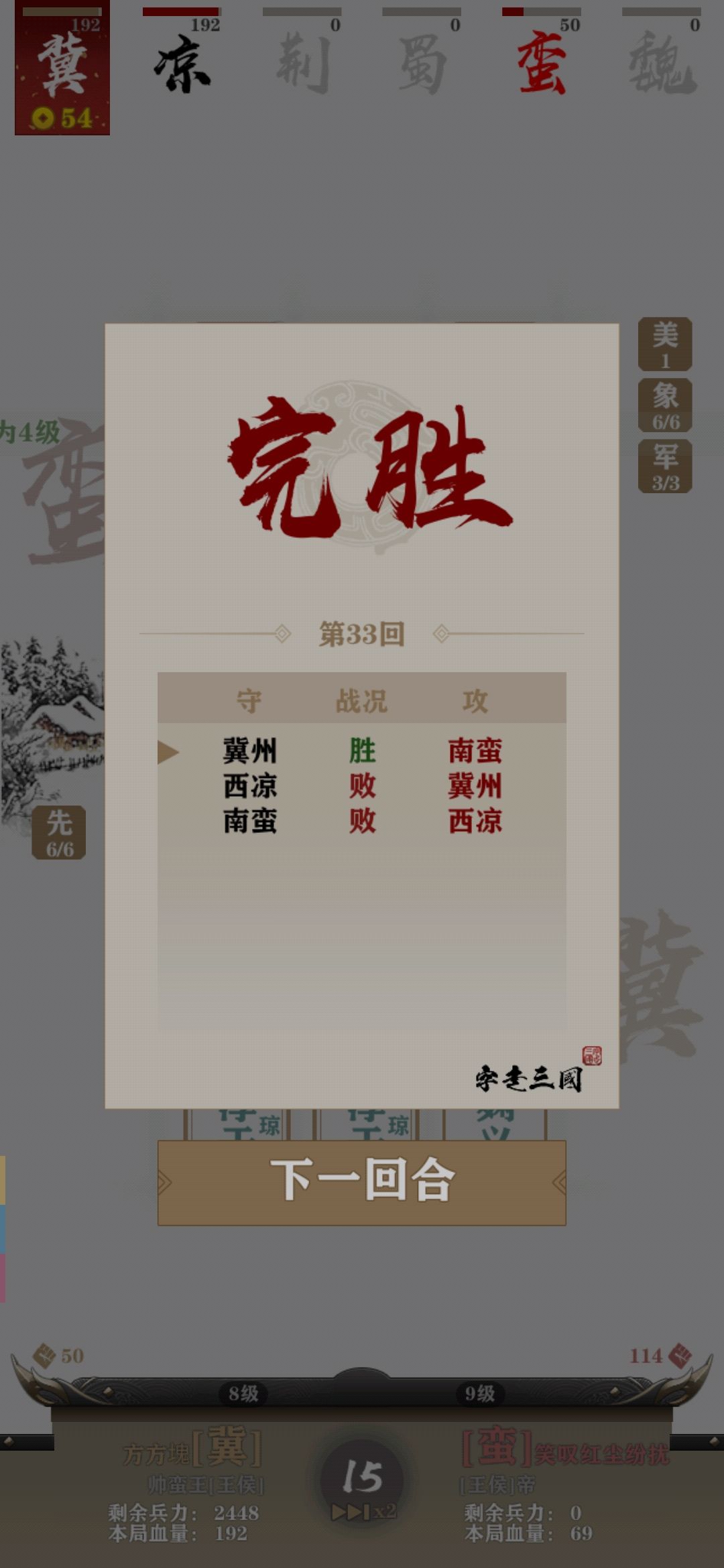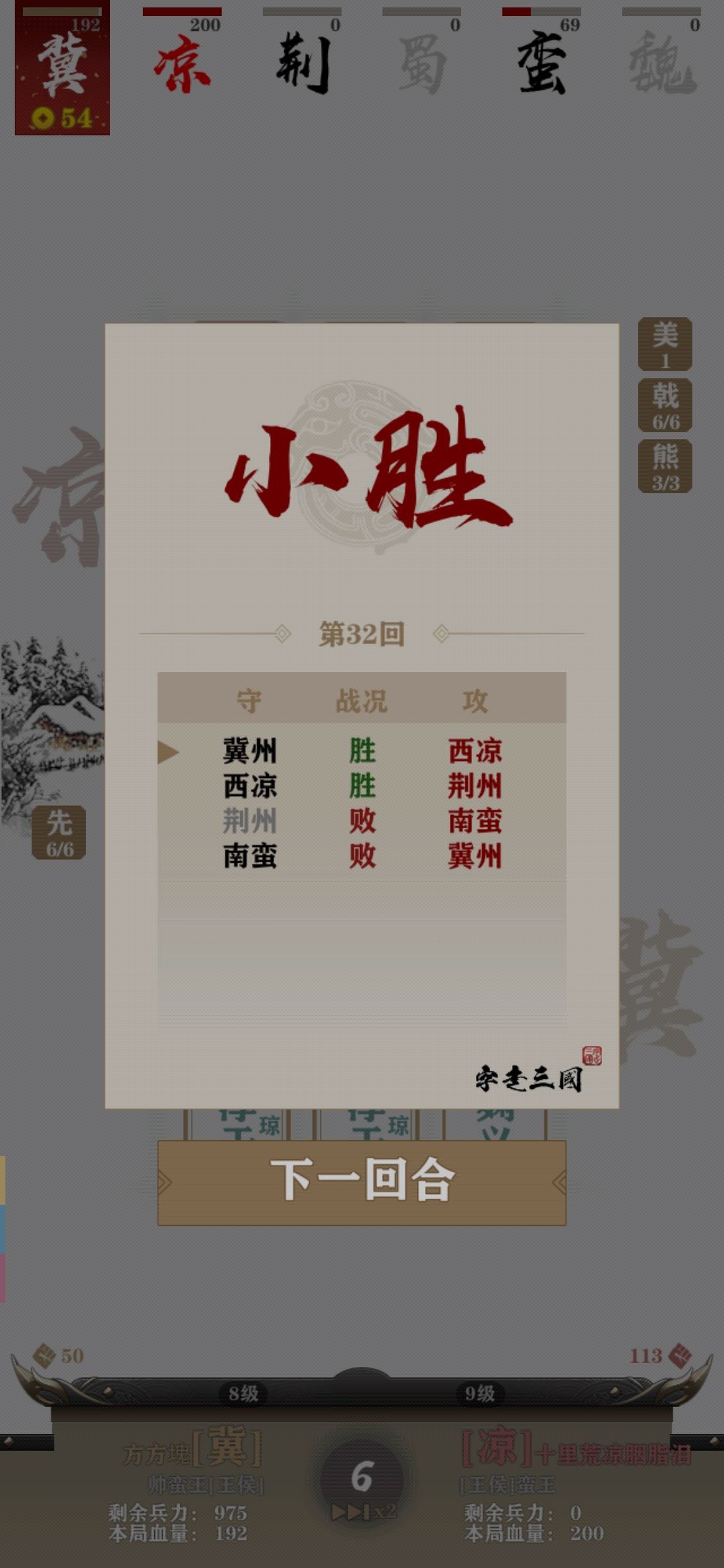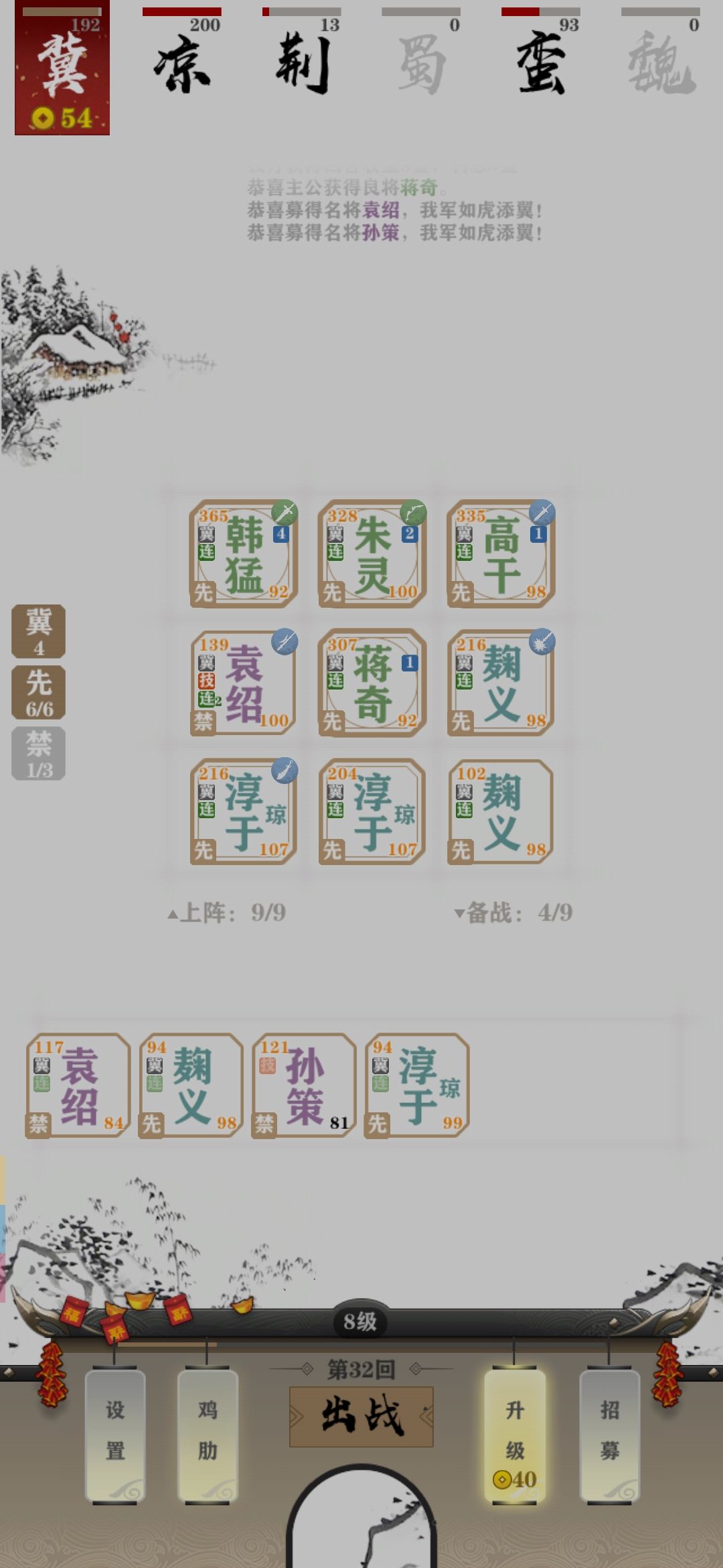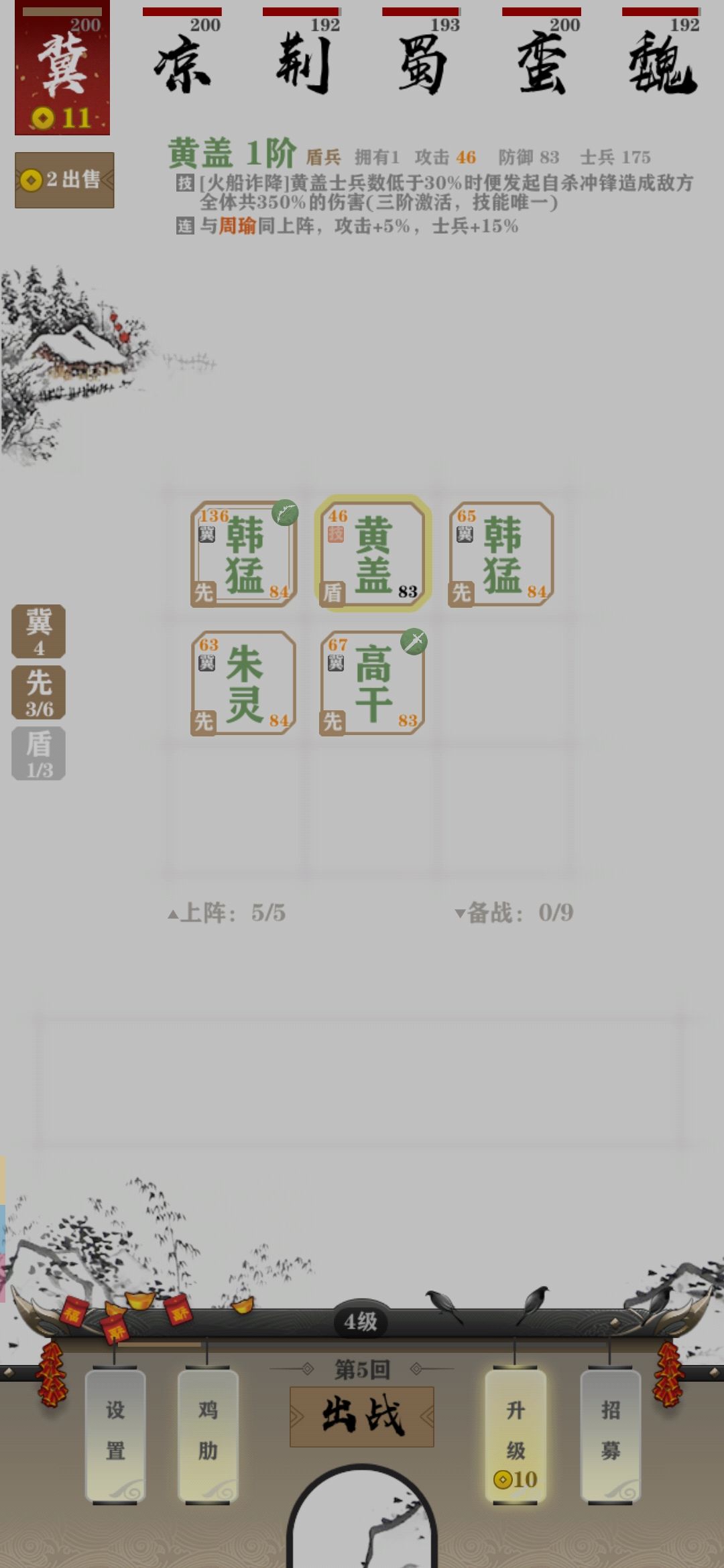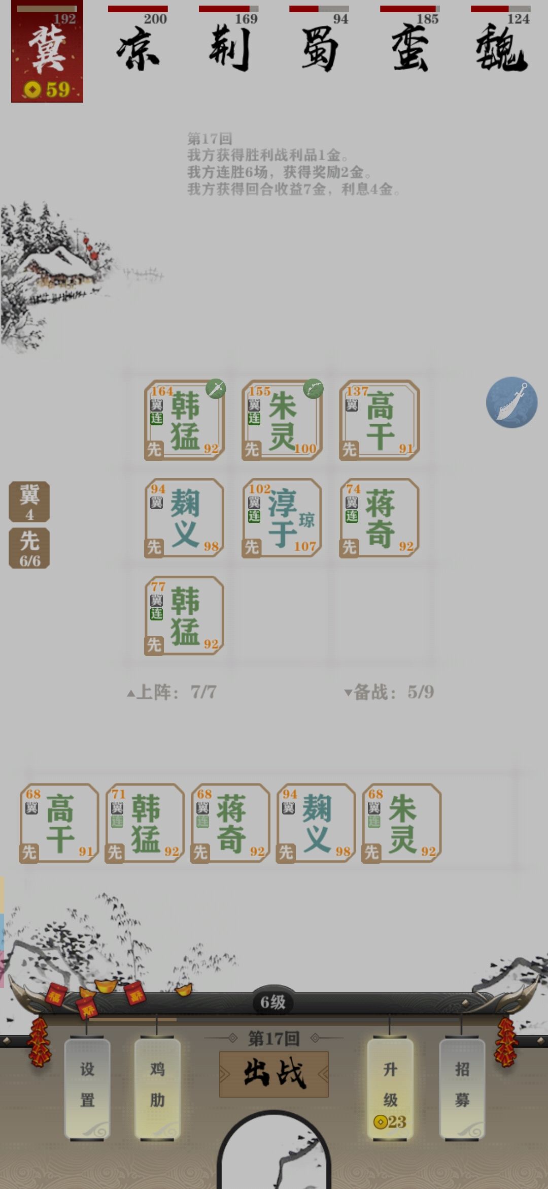 我没这运气,老实拿打工仔,这个骑兵羁绊基本就是好看没用,脸黑也没出高品质的将,这战力基本拉胯,下回合之前全卖。
