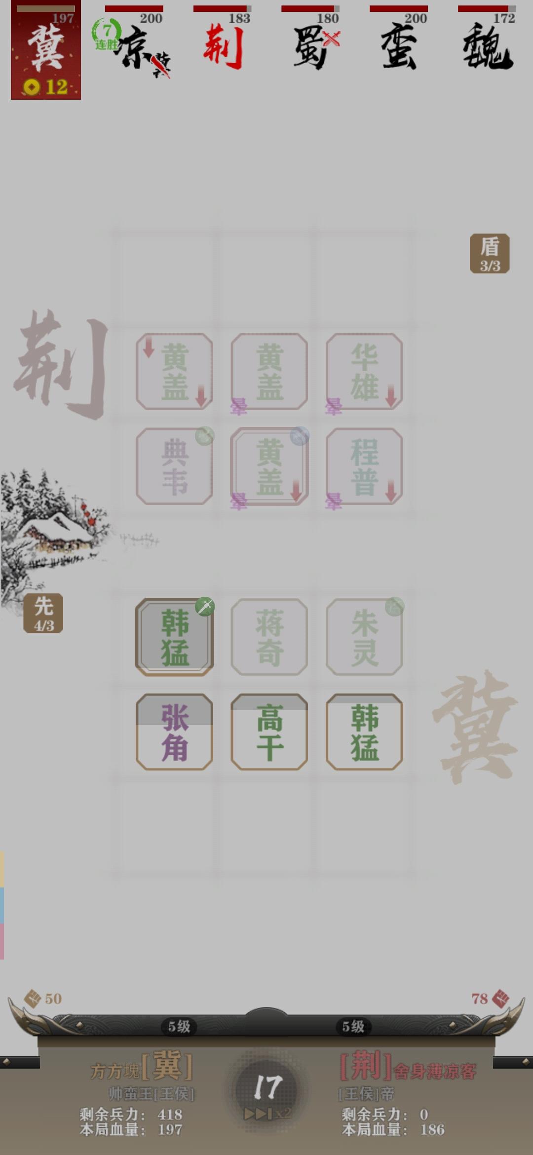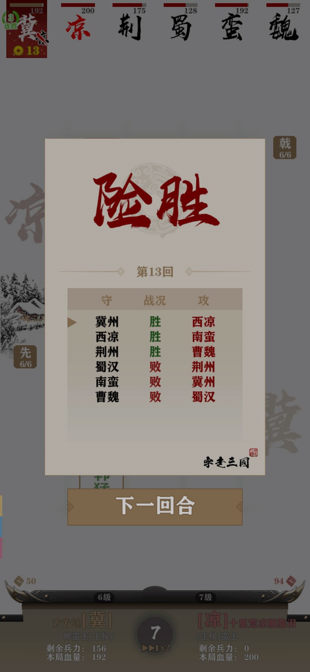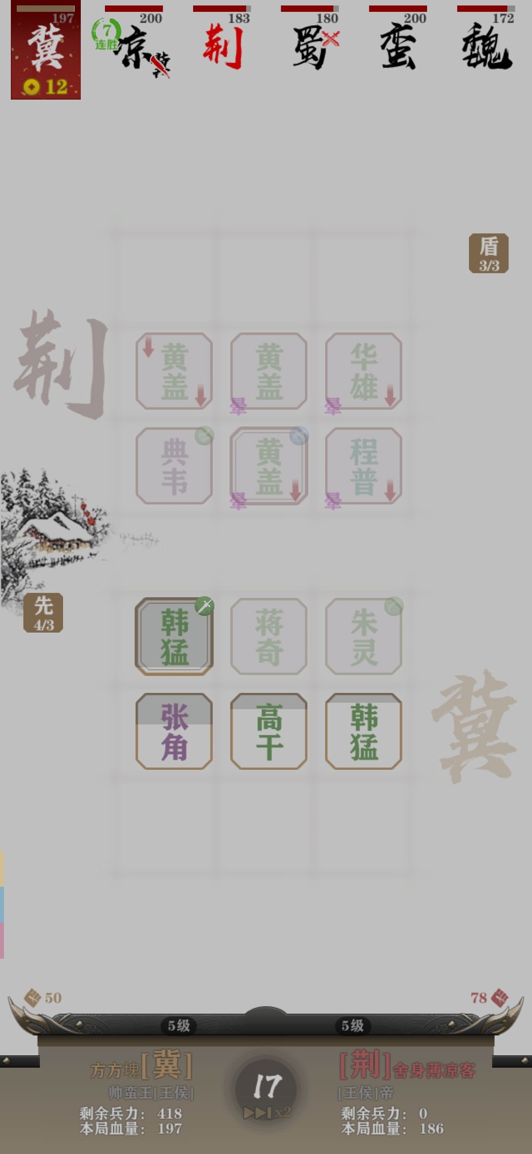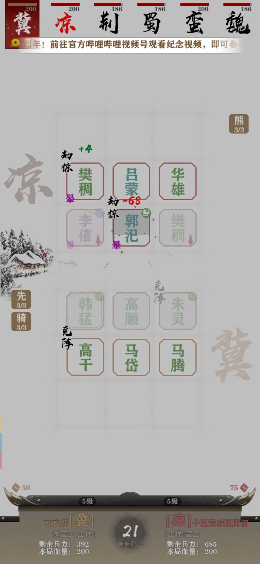 我没这运气,老实拿打工仔,这个骑兵羁绊基本就是好看没用,脸黑也没出高品质的将,这战力基本拉胯,下回合之前全卖。