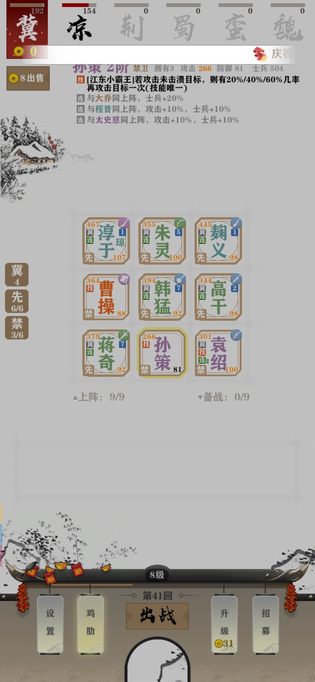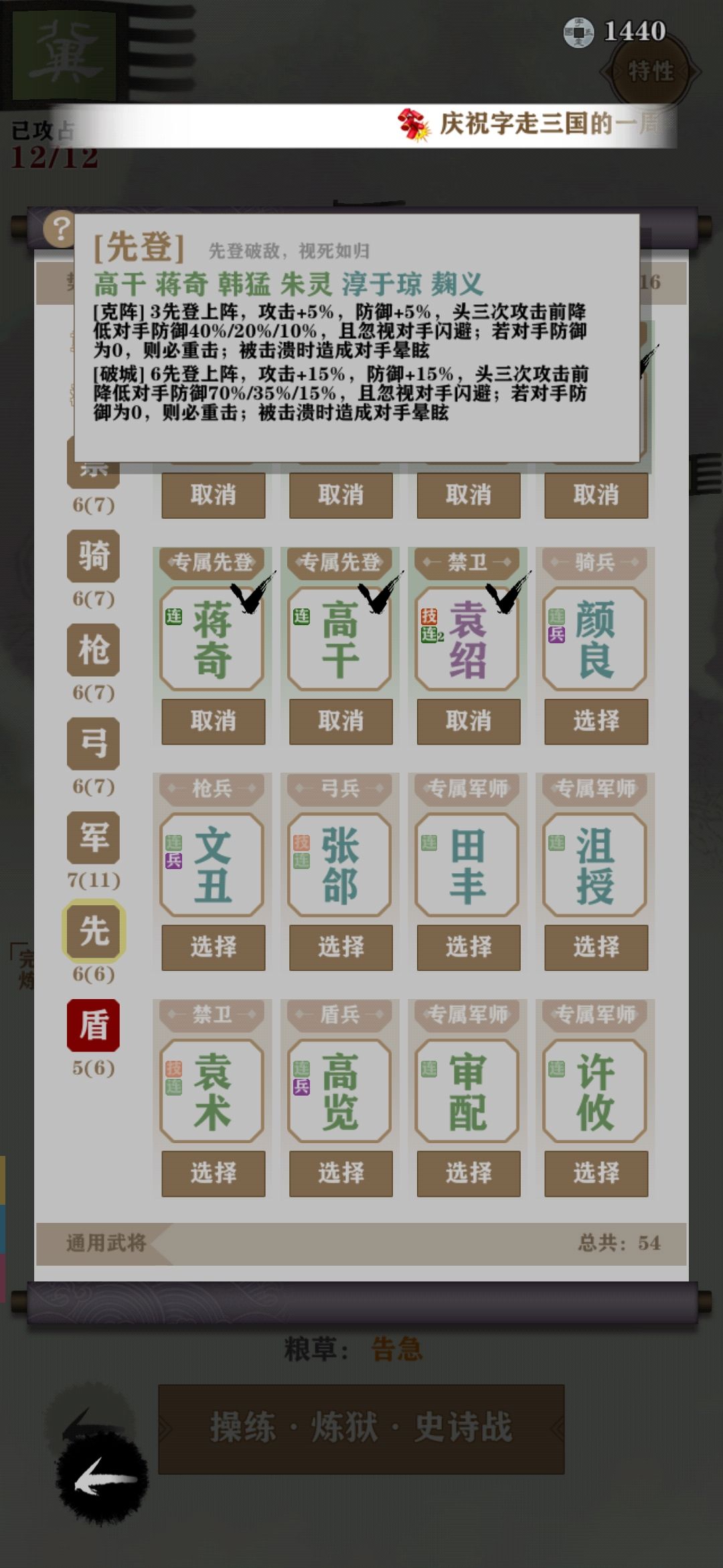 4.先登升阶为第一要务。单纯的一阶一碰就倒,不升阶等于没这人,所以先登全拿,升三不分先后。禁军袁绍曹操见到必拿,曹操不上也不能给别人。孙策不鸡肋可以不拿防止卡格子到大后期随便凑个二阶就能用。等你有5个以上三阶先登再出3禁羁绊就行。8先登因为亡语眩晕的存在有他内在的强度,除非因为都升三了才用禁军凑格子,还有就是不要觉得6个先登无敌就只上6人,每多一个人都是在增加先登眩晕的收益。