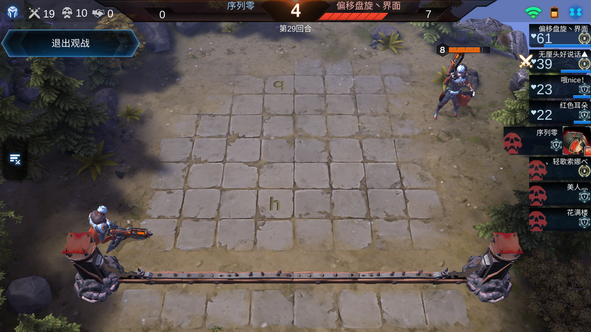 妹的,在第一个玩家死之前打了20回合,刨去打野怪4回合的16个回合里我碰到同一个玩家6回快站一半了,在有玩家死了之后就更过分了,随便和一个玩家或者野怪打完下一个铁定是他,这家伙还是我们这场的第一。。。。。。