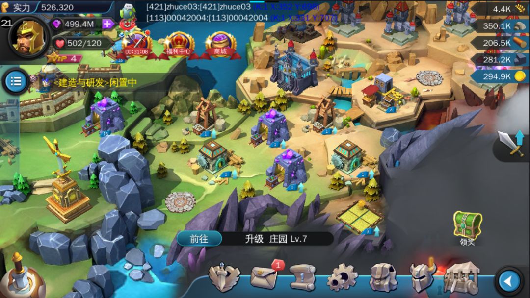 游戏中资源分为粮食、石头、木材、铁矿和金币五项基础资源,以及公会币和水晶。