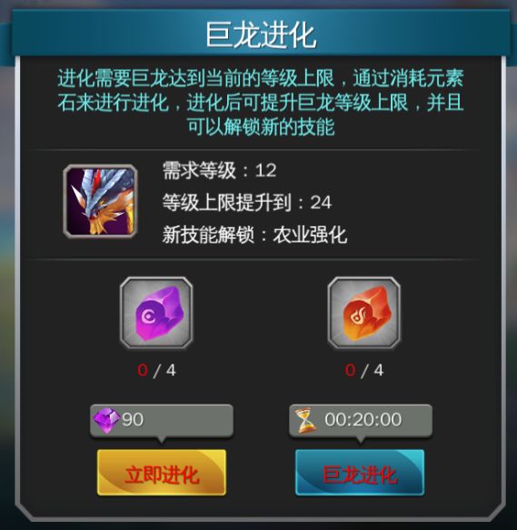 除了升级,攻城兽还可以进化。进化需要攻城兽达到当前品质的等级上限,才能够通过消耗【元素石】来进化。进化后攻城兽的品质会得到提升,并且等级上限也会提高,不仅如此,进化还可解锁新技能,为玩家带来更多的增益效果。同样的【元素石】也可以通过开启【巨龙秘宝】获得,所以玩家若想让攻城兽变得更加强大,就需要尽可能多的合成【巨龙秘宝】咯。